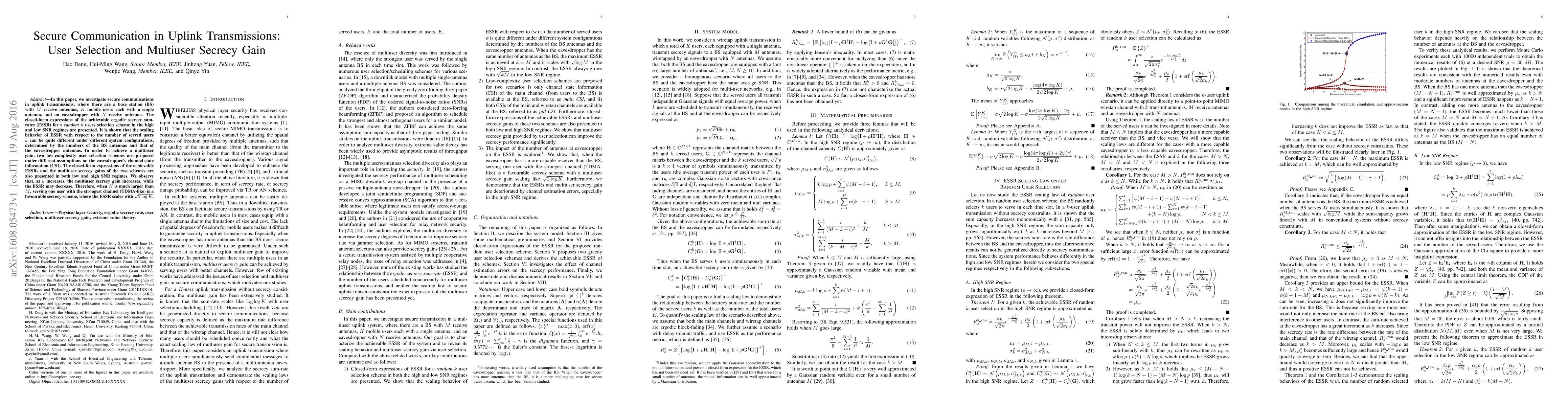 In this paper, we investigate secure communications in uplink transmissions, where there are a base station (BS) with M receive antennas, K mobile users each with a single antenna, and an eavesdropper with N receive antennas. The closed-form expressions of the achievable ergodic secrecy sumrates (ESSR) for a random k users selection scheme in the high and low SNR regimes are presented. It is shown that the scaling behavior of ESSR with respect to the number of served users k can be quite different under different system configurations, determined by the numbers of the BS antennas and that of the eavesdropper antennas. In order to achieve a multiuser gain, two low-complexity user selection schemes are proposed under different assumptions on the eavesdropper's channel state information (CSI). The closed-form expressions of the achievable ESSRs and the multiuser secrecy gains of the two schemes are also presented in both low and high SNR regimes. We observe that, as k increases, the multiuser secrecy gain increases, while the ESSR may decrease. Therefore, when N is much larger than M, serving one user with the strongest channel (TDMA-like) is a favourable secrecy scheme, where the ESSR scales with root square of 2 log K.