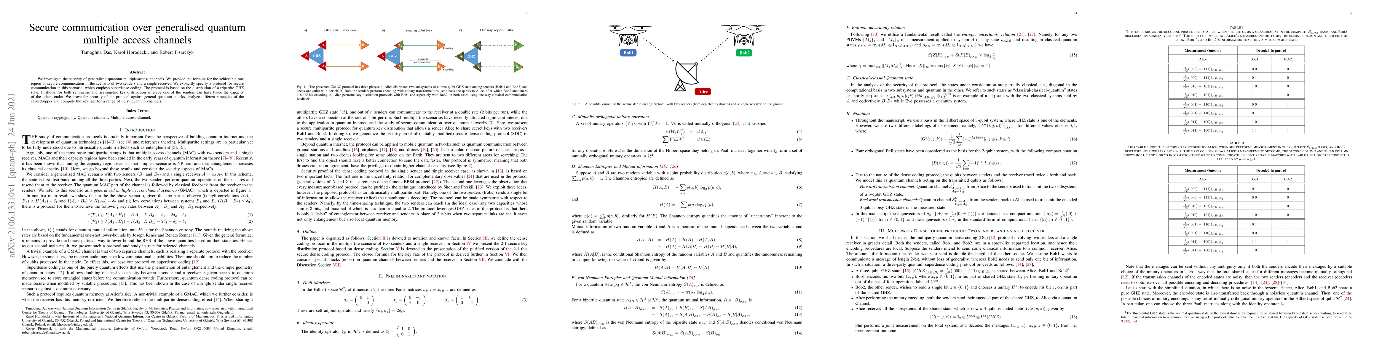 This paper explores secure communication over generalized quantum multiple-access channels, presenting a protocol for two senders and one receiver using superdense coding and a tripartite GHZ state. The protocol enables both symmetric and asymmetric key distribution and is proven secure against general quantum attacks.