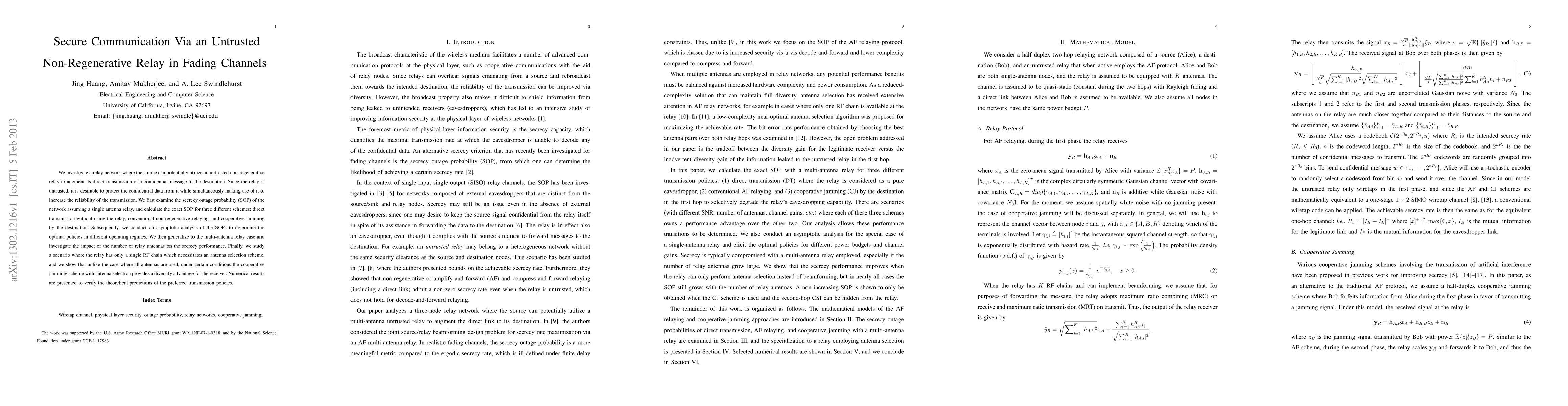 This paper explores secure communication in a relay network using an untrusted non-regenerative relay to enhance message transmission reliability while maintaining data confidentiality. It analyzes the secrecy outage probability under various schemes, including direct transmission, conventional relaying, and cooperative jamming, and determines optimal policies through asymptotic analysis and multi-antenna relay considerations.