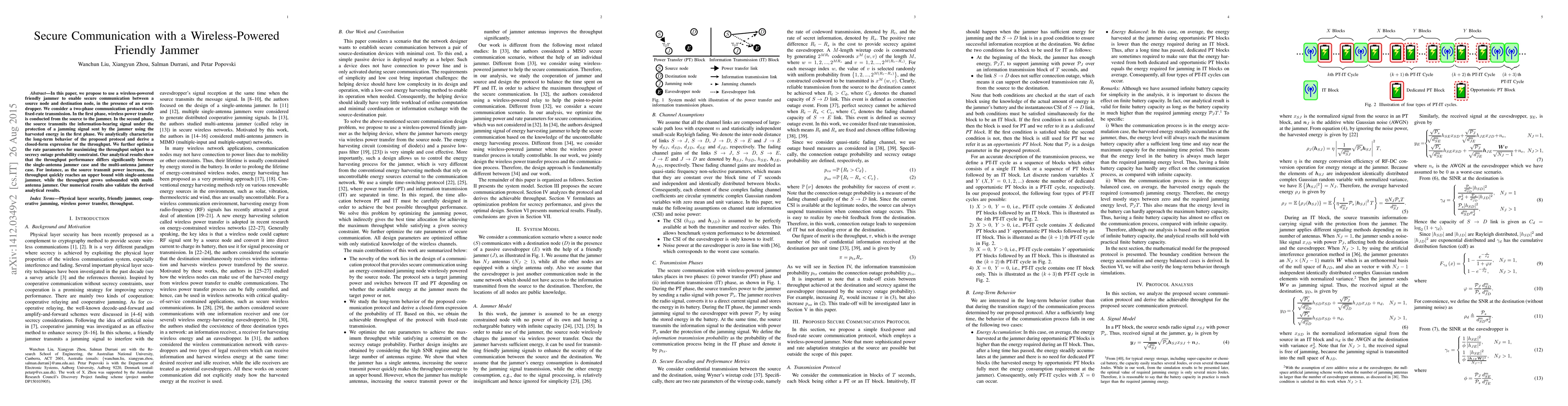 This paper proposes a secure communication protocol using a wireless-powered friendly jammer to protect data transmission between a source and a destination node against eavesdroppers. The protocol involves two phases: wireless power transfer to the jammer followed by information transmission with jamming, and it optimizes throughput while considering secrecy constraints.