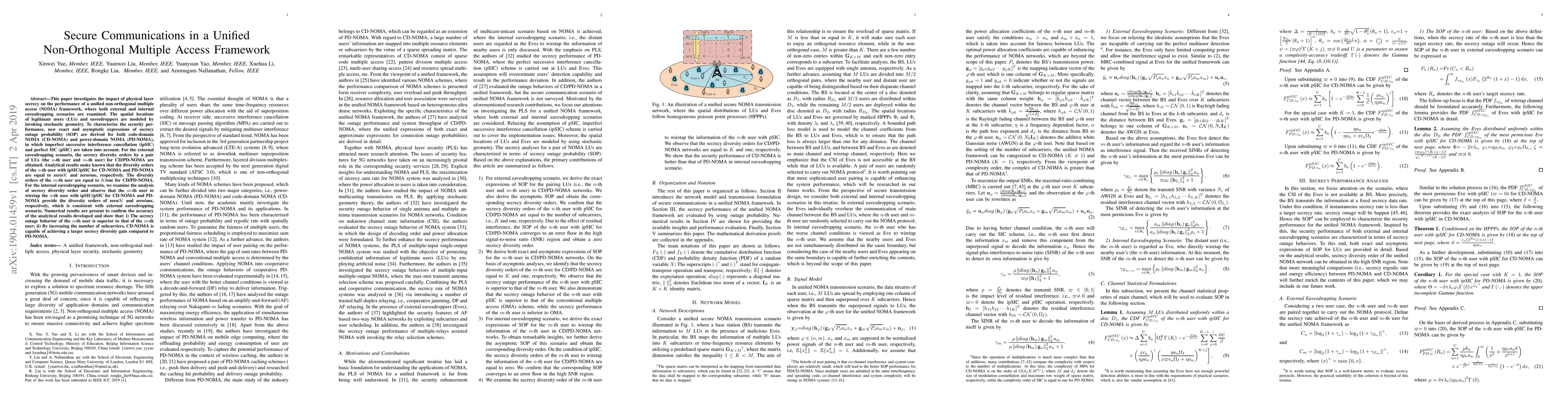 This paper investigates the impact of physical layer secrecy on the performance of a unified non-orthogonal multiple access (NOMA) framework, where both external and internal eavesdropping scenarios are examined. The spatial locations of legitimate users (LUs) and eavesdroppers are modeled by invoking stochastic geometry. To characterize the security performance, new exact and asymptotic expressions of secrecy outage probability (SOP) are derived for both code-domain NOMA (CD-NOMA) and power-domain NOMA (PD-NOMA), in which imperfect successive interference cancellation (ipSIC) and perfect SIC (pSIC) are taken into account. For the external eavesdropping scenario, the secrecy diversity orders by a pair of LUs (the n-th user and m-th user) for CD/PD-NOMA are obtained. Analytical results make known that the diversity orders of the $n$-th user with ipSIC/pSIC for CD-NOMA and PD-NOMA are equal to zero/K and zero/one, respectively. The diversity orders of the m-th user are equal to K/one for CD/PD-NOMA. For the internal eavesdropping scenario, we examine the analysis of secrecy diversity order and observe that the m-th user to wiretap the n-th user with ipSIC/pSIC for CD-NOMA and PD-NOMA provide the diversity orders of zero/K and zero/one, respectively, which is consistent with external eavesdropping scenario. Numerical results are present to confirm the accuracy of the analytical results developed and show that: i) The secrecy outage behavior of the $n$-th user is superior to that of the m-th user; ii) By increasing the number of subcarriers, CD-NOMA is capable of achieving a larger secrecy diversity gain compared to PD-NOMA.