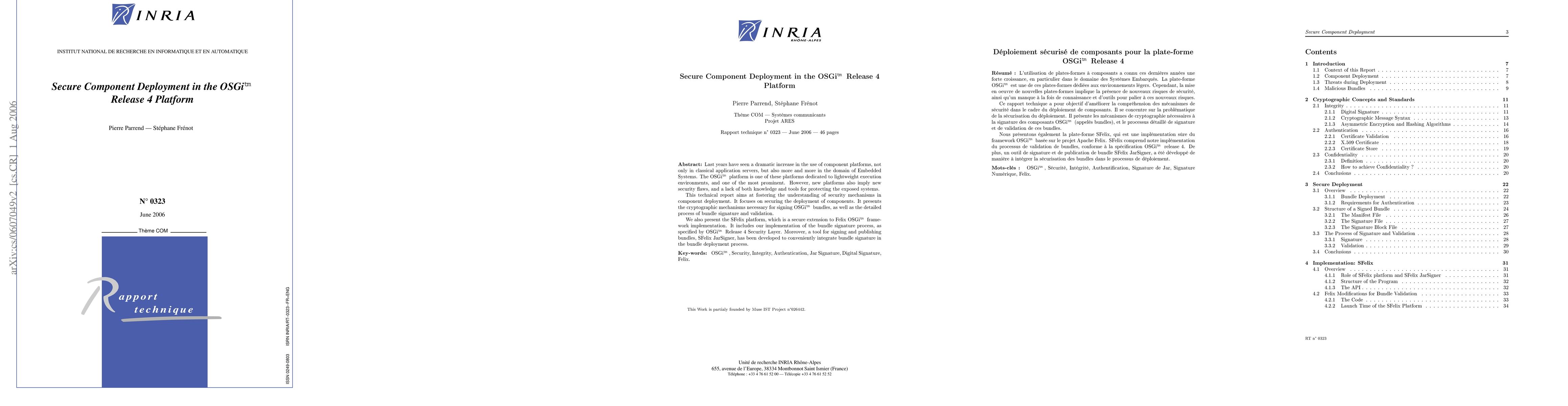 Last years have seen a dramatic increase in the use of component platforms, not only in classical application servers, but also more and more in the domain of Embedded Systems. The OSGi(tm) platform is one of these platforms dedicated to lightweight execution environments, and one of the most prominent. However, new platforms also imply new security flaws, and a lack of both knowledge and tools for protecting the exposed systems. This technical report aims at fostering the understanding of security mechanisms in component deployment. It focuses on securing the deployment of components. It presents the cryptographic mechanisms necessary for signing OSGi(tm) bundles, as well as the detailed process of bundle signature and validation. We also present the SFelix platform, which is a secure extension to Felix OSGi(tm) framework implementation. It includes our implementation of the bundle signature process, as specified by OSGi(tm) Release 4 Security Layer. Moreover, a tool for signing and publishing bundles, SFelix JarSigner, has been developed to conveniently integrate bundle signature in the bundle deployment process.