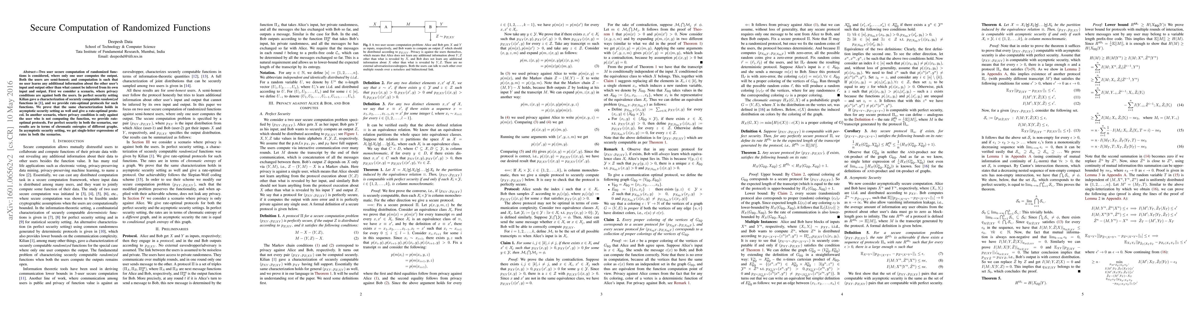 This paper presents protocols for secure computation of randomized functions between two users, ensuring privacy under semi-honest conditions. It provides rate-optimal solutions in perfect and asymptotic security settings, characterized by chromatic entropies of graphs. The work also offers protocols for scenarios where privacy is only required for the non-computing user.