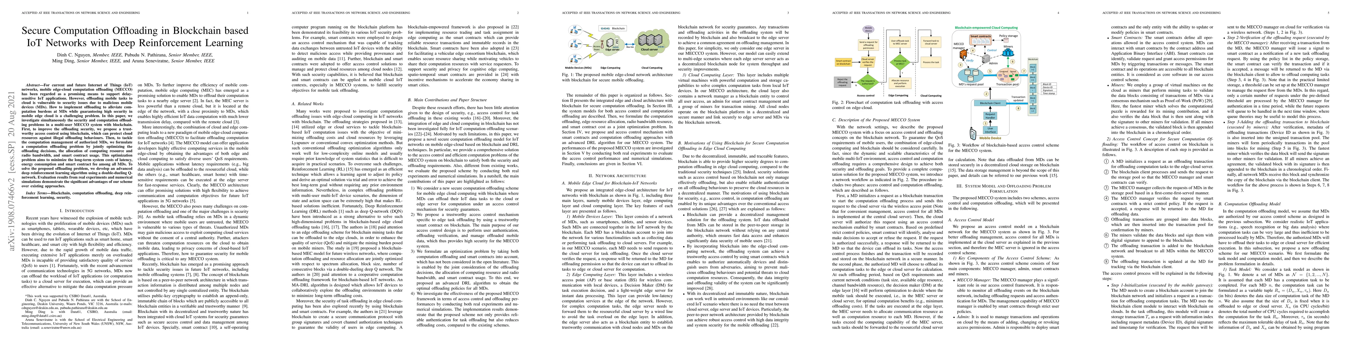 This paper proposes a secure computation offloading method in blockchain-based IoT networks using deep reinforcement learning to address security and resource allocation challenges. It employs blockchain for trustworthy access control and a double-dueling Q-network to optimize offloading decisions, minimizing latency, energy, and smart contract fees.