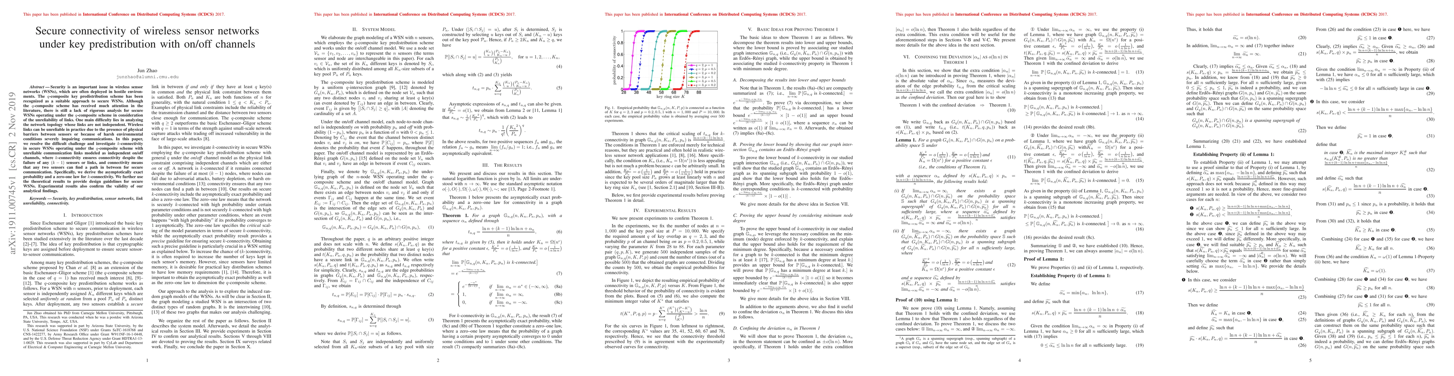 Security is an important issue in wireless sensor networks (WSNs), which are often deployed in hostile environments. The q-composite key predistribution scheme has been recognized as a suitable approach to secure WSNs. Although the q-composite scheme has received much attention in the literature, there is still a lack of rigorous analysis for secure WSNs operating under the q-composite scheme in consideration of the unreliability of links. One main difficulty lies in analyzing the network topology whose links are not independent. Wireless links can be unreliable in practice due to the presence of physical barriers between sensors or because of harsh environmental conditions severely impairing communications. In this paper, we resolve the difficult challenge and investigate k-connectivity in secure WSNs operating under the q-composite scheme with unreliable communication links modeled as independent on/off channels, where k-connectivity ensures connectivity despite the failure of any (k - 1) sensors or links, and connectivity means that any two sensors can find a path in between for secure communication. Specifically, we derive the asymptotically exact probability and a zero-one law for k-connectivity. We further use the theoretical results to provide design guidelines for secure WSNs. Experimental results also confirm the validity of our analytical findings.