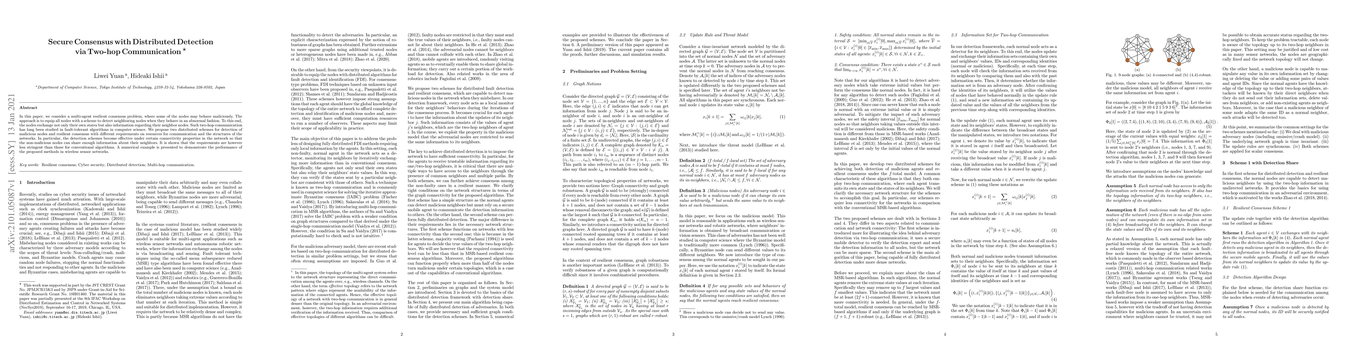In this paper, we consider a multi-agent resilient consensus problem, where some of the nodes may behave maliciously. The approach is to equip all nodes with a scheme to detect neighboring nodes when they behave in an abnormal fashion. To this end, the nodes exchange not only their own states but also information regarding their neighbor nodes. Such two-hop communication has long been studied in fault-tolerant algorithms in computer science. We propose two distributed schemes for detection of malicious nodes and resilient consensus with different requirements on resources for communication and the structures of the networks. In particular, the detection schemes become effective under certain connectivity properties in the network so that the non-malicious nodes can share enough information about their neighbors. It is shown that the requirements are however less stringent than those for conventional algorithms. A numerical example is presented to demonstrate the performance of the proposed methods in wireless sensor networks.