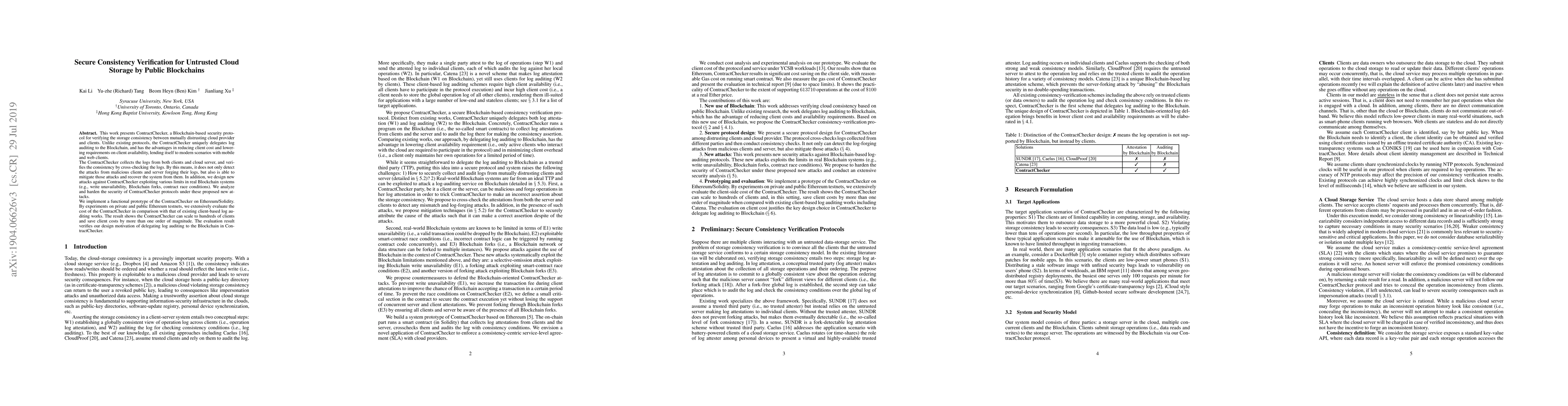 This paper introduces ContractChecker, a blockchain-based protocol for verifying storage consistency between distrusting cloud providers and clients, leveraging blockchain for log auditing to reduce client costs. The authors also analyze and mitigate new attacks against the protocol and demonstrate its efficiency through a prototype on Ethereum.