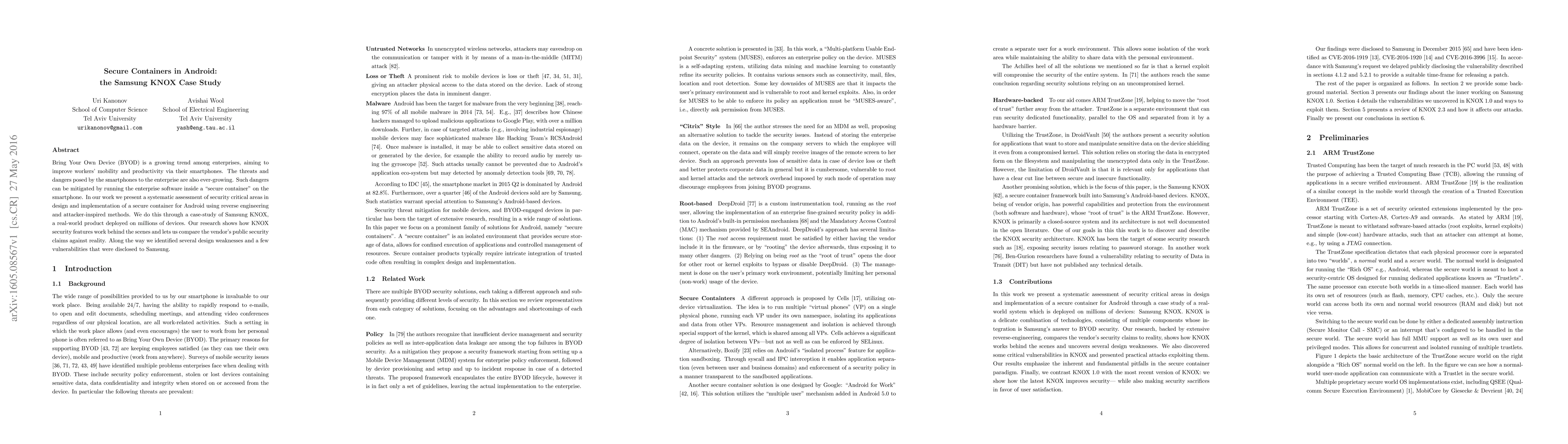 This paper conducts a detailed reverse engineering study of Samsung KNOX, an Android secure container for BYOD, to evaluate its design and implementation security. The findings reveal discrepancies between KNOX's public security claims and its actual security features, highlighting design flaws and vulnerabilities that were reported to Samsung.
