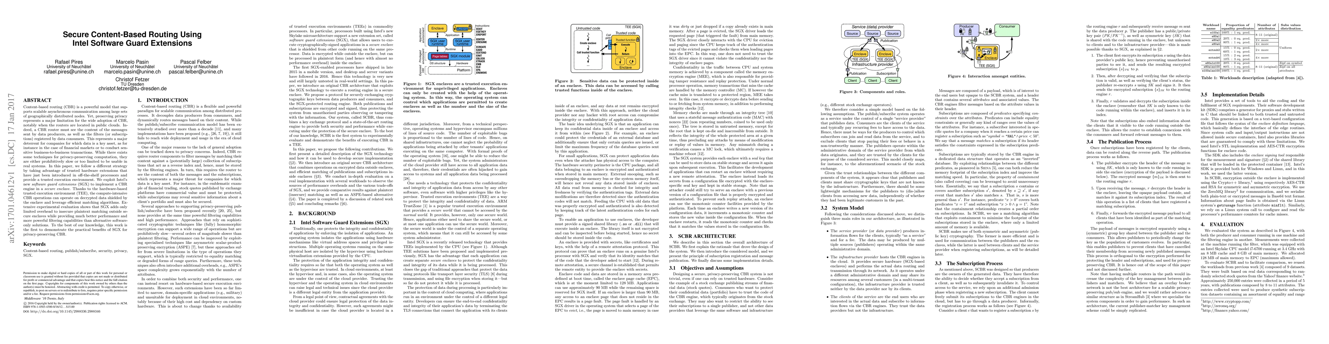 Content-based routing (CBR) is a powerful model that supports scalable asynchronous communication among large sets of geographically distributed nodes. Yet, preserving privacy represents a major limitation for the wide adoption of CBR, notably when the routers are located in public clouds. Indeed, a CBR router must see the content of the messages sent by data producers, as well as the filters (or subscriptions) registered by data consumers. This represents a major deterrent for companies for which data is a key asset, as for instance in the case of financial markets or to conduct sensitive business-to-business transactions. While there exists some techniques for privacy-preserving computation, they are either prohibitively slow or too limited to be usable in real systems. In this paper, we follow a different strategy by taking advantage of trusted hardware extensions that have just been introduced in off-the-shelf processors and provide a trusted execution environment. We exploit Intel's new software guard extensions (SGX) to implement a CBR engine in a secure enclave. Thanks to the hardware-based trusted execution environment (TEE), the compute-intensive CBR operations can operate on decrypted data shielded by the enclave and leverage efficient matching algorithms. Extensive experimental evaluation shows that SGX adds only limited overhead to insecure plaintext matching outside secure enclaves while providing much better performance and more powerful filtering capabilities than alternative software-only solutions. To the best of our knowledge, this work is the first to demonstrate the practical benefits of SGX for privacy-preserving CBR.