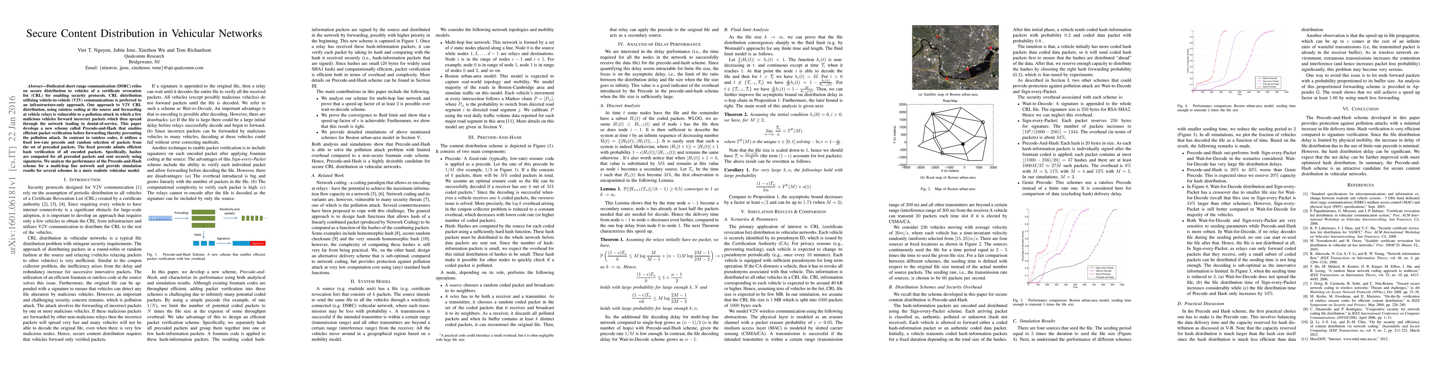 This paper proposes a new Precode-and-Hash scheme for secure certificate revocation list (CRL) distribution in vehicular networks, addressing vulnerabilities to pollution attacks. Unlike rateless coding, it uses a fixed low-rate precode and random packet selection, enabling efficient hash verification to prevent malicious packet forwarding.