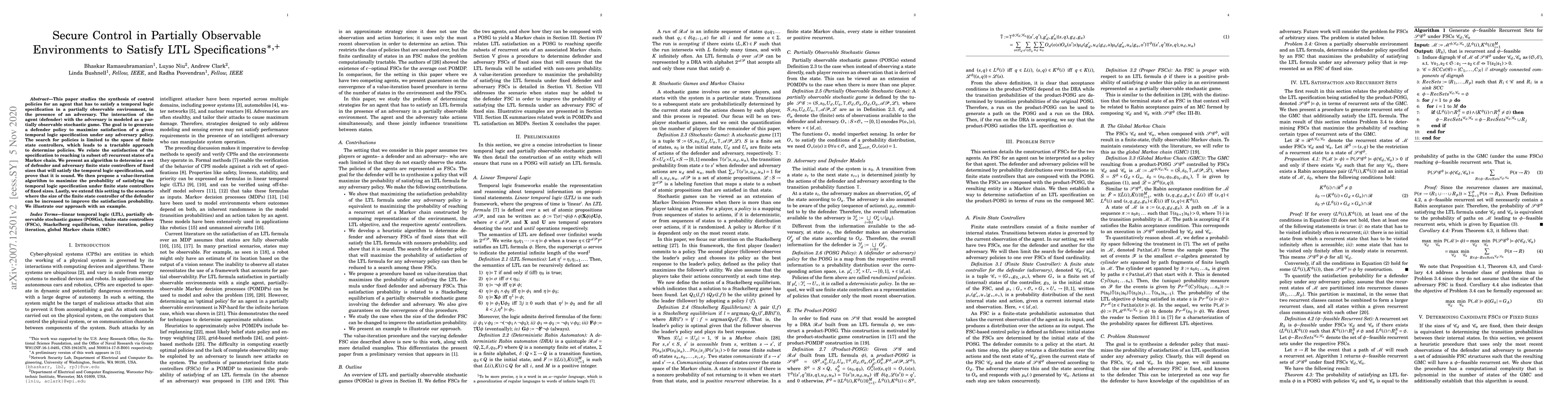 This paper develops a method for synthesizing control policies for an agent to satisfy temporal logic specifications in partially observable environments, even against adversarial actions, using finite state controllers. It presents an algorithm to determine such controllers and a value-iteration method to maximize satisfaction probability, with an example to illustrate the approach.