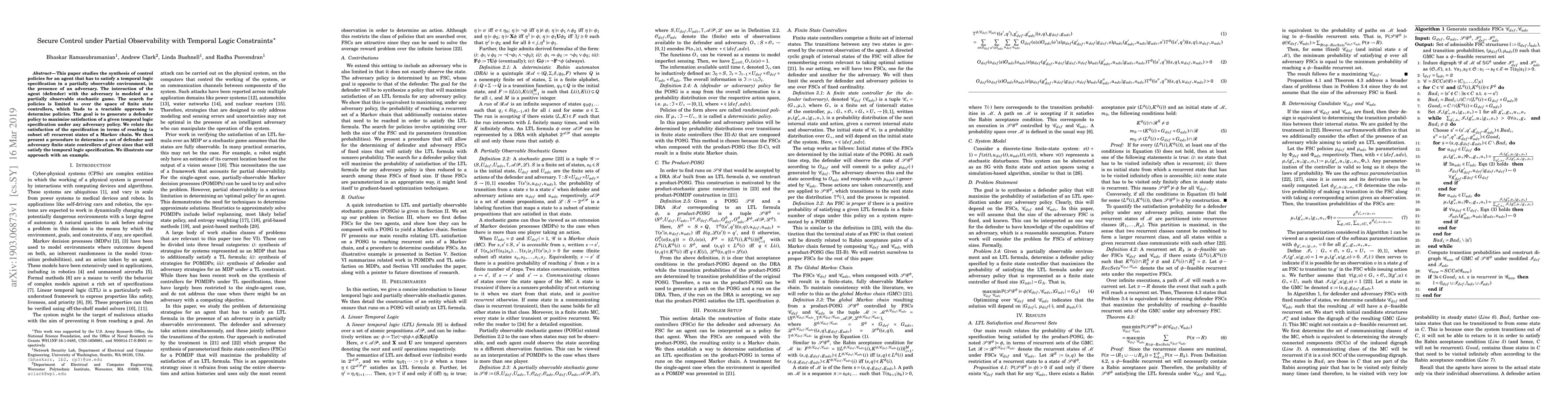 This paper studies the synthesis of control policies for an agent that has to satisfy a temporal logic specification in a partially observable environment, in the presence of an adversary. The interaction of the agent (defender) with the adversary is modeled as a partially observable stochastic game. The search for policies is limited to over the space of finite state controllers, which leads to a tractable approach to determine policies. The goal is to generate a defender policy to maximize satisfaction of a given temporal logic specification under any adversary policy. We relate the satisfaction of the specification in terms of reaching (a subset of) recurrent states of a Markov chain. We then present a procedure to determine a set of defender and adversary finite state controllers of given sizes that will satisfy the temporal logic specification. We illustrate our approach with an example.