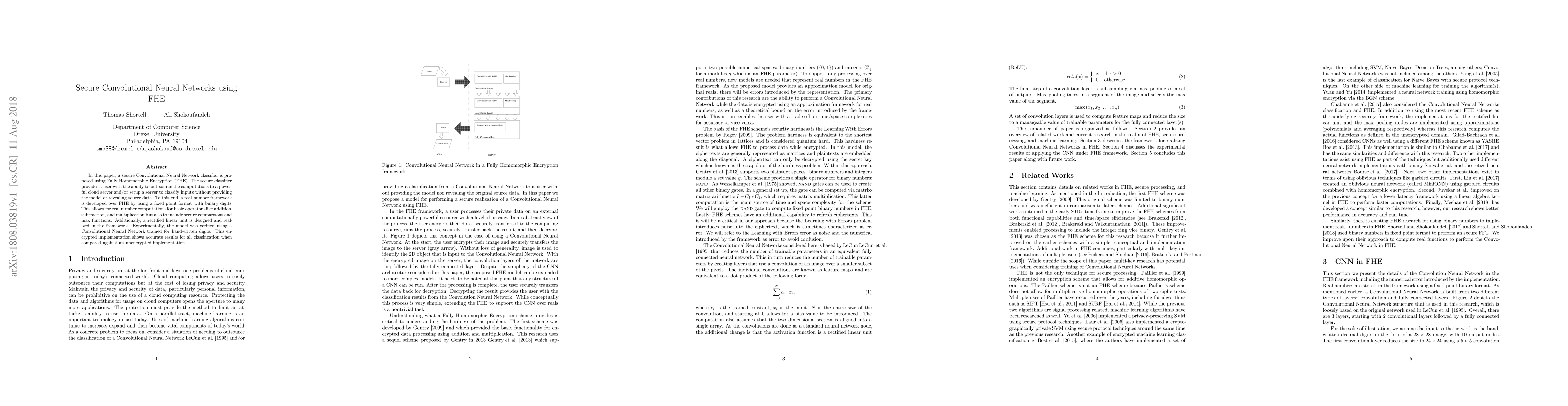 A secure Convolutional Neural Network classifier using Fully Homomorphic Encryption (FHE) is proposed, enabling outsourced computations without revealing model or source data, with accurate results shown in experiments.