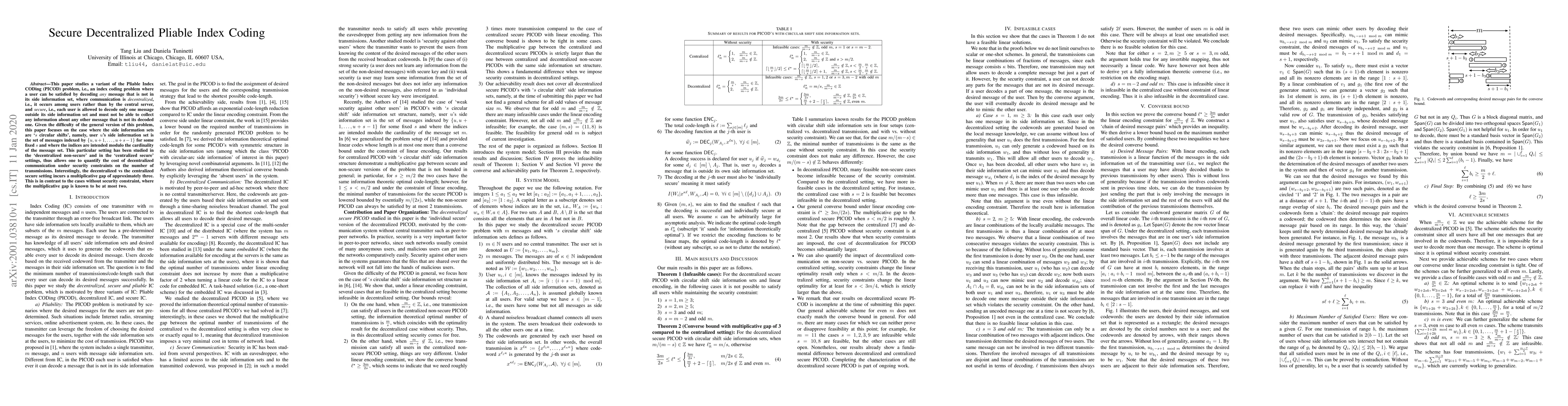 This paper studies a variant of the Pliable Index CODing (PICOD) problem, i.e., an index coding problem where a user can be satisfied by decoding any message that is not in its side information set, where communication is decentralized, i.e., it occurs among users rather than by the central server, and secure, i.e., each user is allowed to decode only one message outside its side information set and must not be able to collect any information about any other message that is not its decoded one. Given the difficulty of the general version of this problem, this paper focuses on the case where the side information sets are `$s$~circular shifts', namely, user $u$'s side information set is the set of messages indexed by $\{u, u+1, \ldots, u+s-1\}$ for some fixed $s$ and where the indices are intended modulo the cardinality of the message set. This particular setting has been studied in the `decentralized non-secure' and in the `centralized secure' settings, thus allows one to quantify the cost of decentralized communication under security constraints on the number of transmissions. Interestingly, the decentralized vs the centralized secure setting incurs a multiplicative gap of approximately~three. This is in contrast to the cases without security constraint, where the multiplicative gap is known to be at most two.