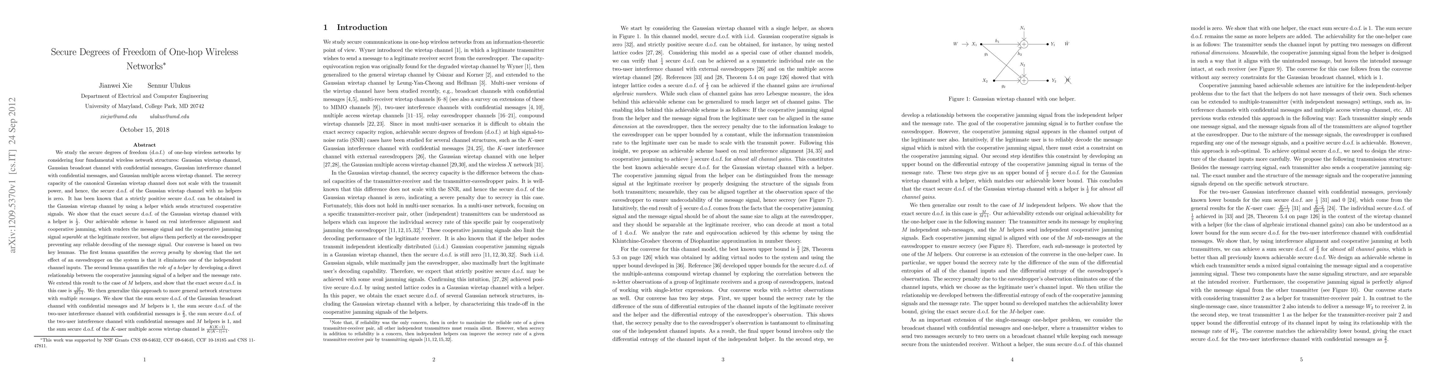 This paper investigates the secure degrees of freedom (d.o.f.) in various one-hop wireless networks, demonstrating that the Gaussian wiretap channel with a helper achieves a secure d.o.f. of 1/2. It extends these findings to multiple helpers, general network structures, and concludes with specific secure d.o.f. results for broadcast, interference, and multiple access channels.