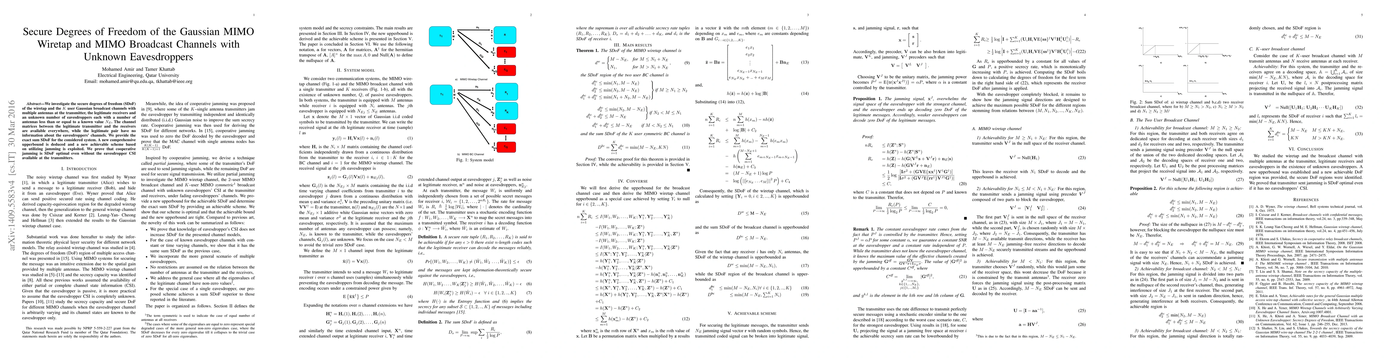 This paper investigates the secure degrees of freedom (SDoF) for Gaussian MIMO wiretap and broadcast channels with unknown eavesdroppers. It provides an exact sum SDoF, deduces a new upperbound, and proposes a jamming-based achievable scheme that proves cooperative jamming is SDoF optimal without eavesdropper channel state information.