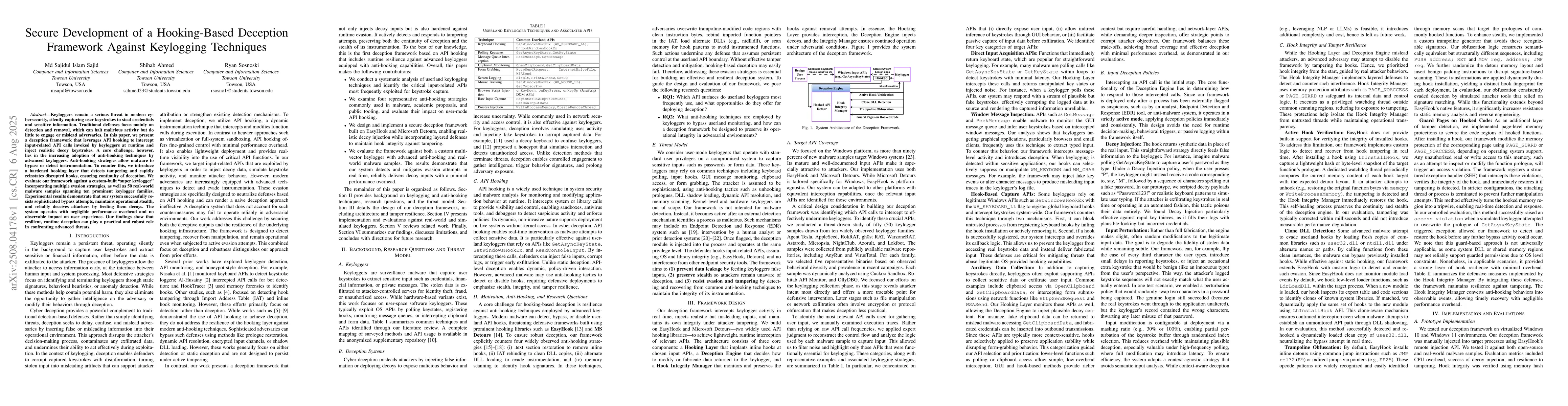 Keyloggers remain a serious threat in modern cybersecurity, silently capturing user keystrokes to steal credentials and sensitive information. Traditional defenses focus mainly on detection and removal, which can halt malicious activity but do little to engage or mislead adversaries. In this paper, we present a deception framework that leverages API hooking to intercept input-related API calls invoked by keyloggers at runtime and inject realistic decoy keystrokes. A core challenge, however, lies in the increasing adoption of anti-hooking techniques by advanced keyloggers. Anti-hooking strategies allow malware to bypass or detect instrumentation. To counter this, we introduce a hardened hooking layer that detects tampering and rapidly reinstates disrupted hooks, ensuring continuity of deception. We evaluate our framework against a custom-built "super keylogger" incorporating multiple evasion strategies, as well as 50 real-world malware samples spanning ten prominent keylogger families. Experimental results demonstrate that our system successfully resists sophisticated bypass attempts, maintains operational stealth, and reliably deceives attackers by feeding them decoys. The system operates with negligible performance overhead and no observable impact on user experience. Our findings show that resilient, runtime deception can play a practical and robust role in confronting advanced threats.