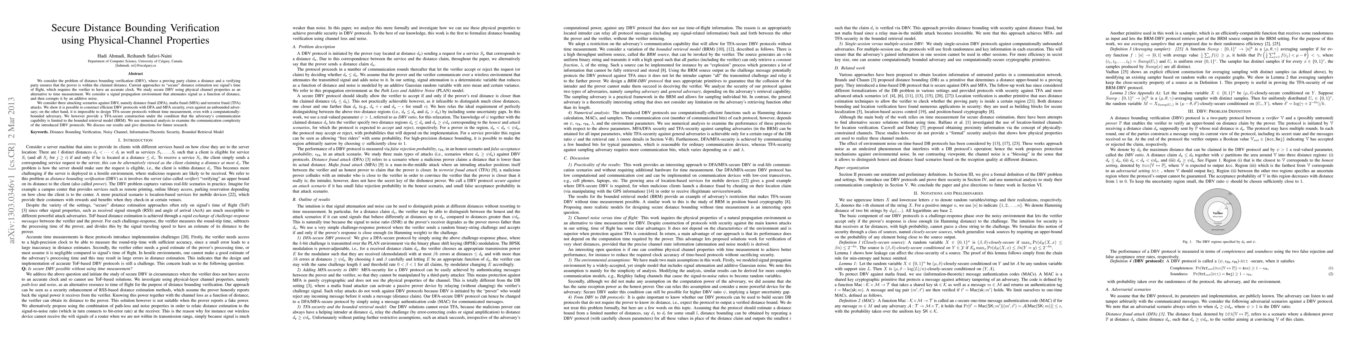 This paper proposes secure distance bounding verification (DBV) protocols that leverage physical channel properties instead of time of flight measurements, addressing fraud attacks like distance fraud, mafia fraud, and terrorist fraud. It demonstrates efficient protocols for DFA and MFA security, while highlighting the limitations in achieving terrorist fraud security without time measurement.