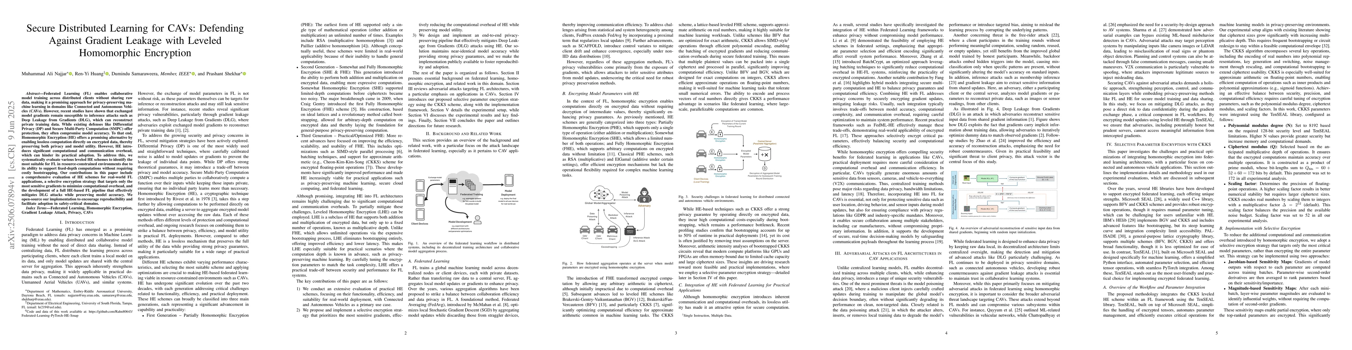 Federated Learning (FL) enables collaborative model training across distributed clients without sharing raw data, making it a promising approach for privacy-preserving machine learning in domains like Connected and Autonomous Vehicles (CAVs). However, recent studies have shown that exchanged model gradients remain susceptible to inference attacks such as Deep Leakage from Gradients (DLG), which can reconstruct private training data. While existing defenses like Differential Privacy (DP) and Secure Multi-Party Computation (SMPC) offer protection, they often compromise model accuracy. To that end, Homomorphic Encryption (HE) offers a promising alternative by enabling lossless computation directly on encrypted data, thereby preserving both privacy and model utility. However, HE introduces significant computational and communication overhead, which can hinder its practical adoption. To address this, we systematically evaluate various leveled HE schemes to identify the most suitable for FL in resource-constrained environments due to its ability to support fixed-depth computations without requiring costly bootstrapping. Our contributions in this paper include a comprehensive evaluation of HE schemes for real-world FL applications, a selective encryption strategy that targets only the most sensitive gradients to minimize computational overhead, and the development of a full HE-based FL pipeline that effectively mitigates DLG attacks while preserving model accuracy. We open-source our implementation to encourage reproducibility and facilitate adoption in safety-critical domains.