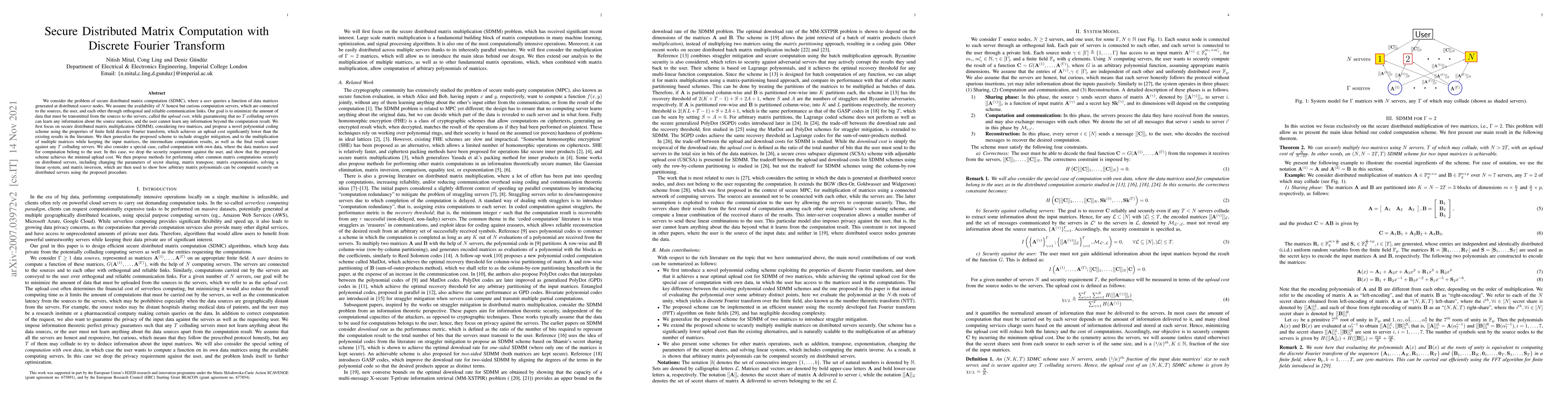 We consider the problem of secure distributed matrix computation (SDMC), where a \textit{user} queries a function of data matrices generated at distributed \textit{source} nodes. We assume the availability of $N$ honest but curious computation servers, which are connected to the sources, the user, and each other through orthogonal and reliable communication links. Our goal is to minimize the amount of data that must be transmitted from the sources to the servers, called the \textit{upload cost}, while guaranteeing that no $T$ colluding servers can learn any information about the source matrices, and the user cannot learn any information beyond the computation result. We first focus on secure distributed matrix multiplication (SDMM), considering two matrices, and propose a novel polynomial coding scheme using the properties of finite field discrete Fourier transform, which achieves an upload cost significantly lower than the existing results in the literature. We then generalize the proposed scheme to include straggler mitigation, and to the multiplication of multiple matrices while keeping the input matrices, the intermediate computation results, as well as the final result secure against any $T$ colluding servers. We also consider a special case, called computation with own data, where the data matrices used for computation belong to the user. In this case, we drop the security requirement against the user, and show that the proposed scheme achieves the minimal upload cost. We then propose methods for performing other common matrix computations securely on distributed servers, including changing the parameters of secret sharing, matrix transpose, matrix exponentiation, solving a linear system, and matrix inversion, which are then used to show how arbitrary matrix polynomials can be computed securely on distributed servers using the proposed procedure.