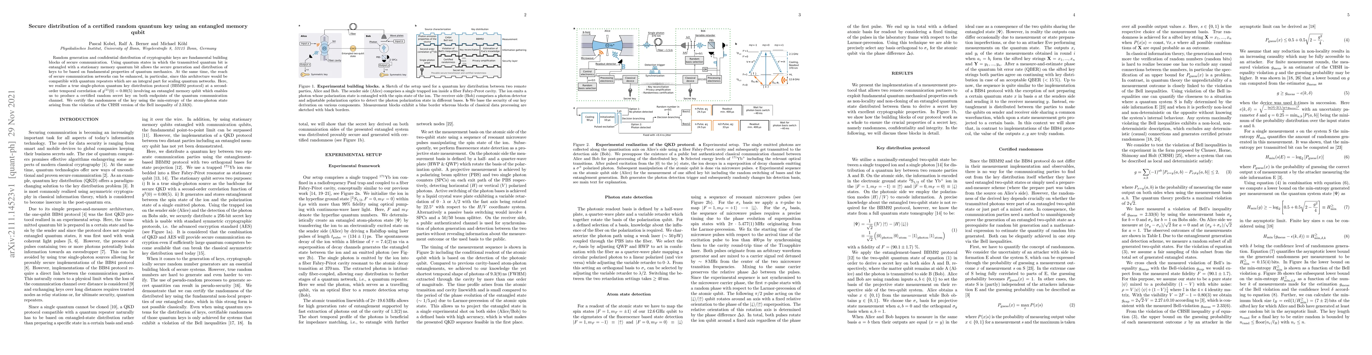Random generation and confidential distribution of cryptographic keys are fundamental building blocks of secure communication. Using quantum states in which the transmitted quantum bit is entangled with a stationary memory quantum bit allows the secure generation and distribution of keys to be based on fundamental properties of quantum mechanics. At the same time, the reach of secure communication networks can be enhanced, in particular, since this architecture would be compatible with quantum repeaters which are an integral part for scaling quantum networks. Here, we realize a true single-photon quantum key distribution protocol (BBM92 protocol) at a second-order temporal correlation of $ {g^{(2)}(0)=0.00(5)}$ involving an entangled memory qubit which enables us to produce a certified random secret key on both endpoints of the quantum communication channel. We certify the randomness of the key using the min-entropy of the atom-photon state arising from the violation of the CHSH version of the Bell inequality of $ 2.33(6)$.