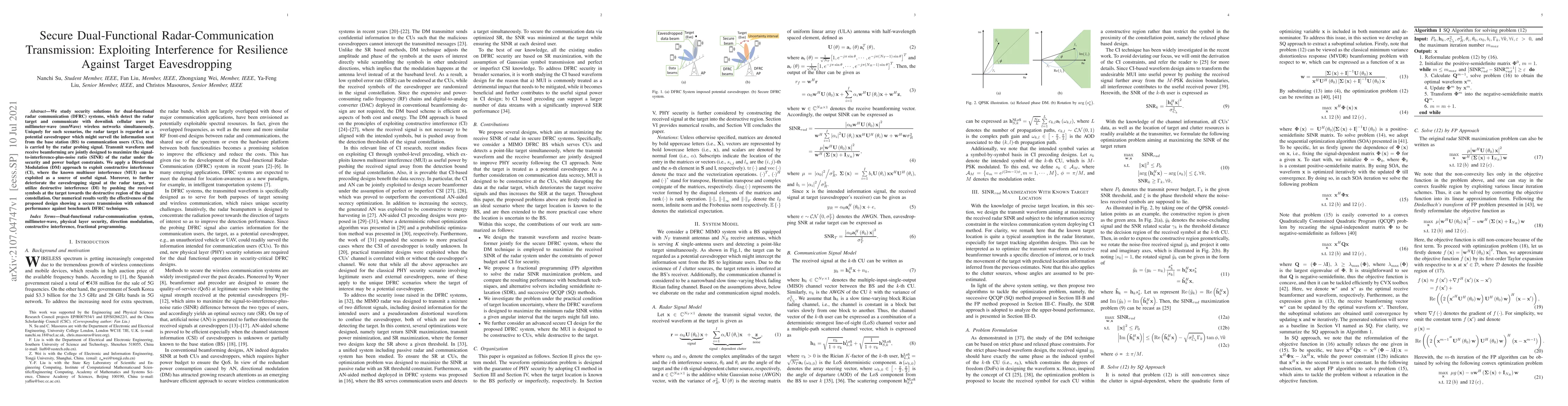 We study security solutions for dual-functional radar communication (DFRC) systems, which detect the radar target and communicate with downlink cellular users in millimeter-wave (mmWave) wireless networks simultaneously. Uniquely for such scenarios, the radar target is regarded as a potential eavesdropper which might surveil the information sent from the base station (BS) to communication users (CUs), that is carried by the radar probing signal. Transmit waveform and receive beamforming are jointly designed to maximize the signal-to-interference-plus-noise ratio (SINR) of the radar under the security and power budget constraints. We apply a Directional Modulation (DM) approach to exploit constructive interference (CI), where the known multiuser interference (MUI) can be exploited as a source of useful signal. Moreover, to further deteriorate the eavesdropping signal at the radar target, we utilize destructive interference (DI) by pushing the received symbols at the target towards the destructive region of the signal constellation. Our numerical results verify the effectiveness of the proposed design showing a secure transmission with enhanced performance against benchmark DFRC techniques.