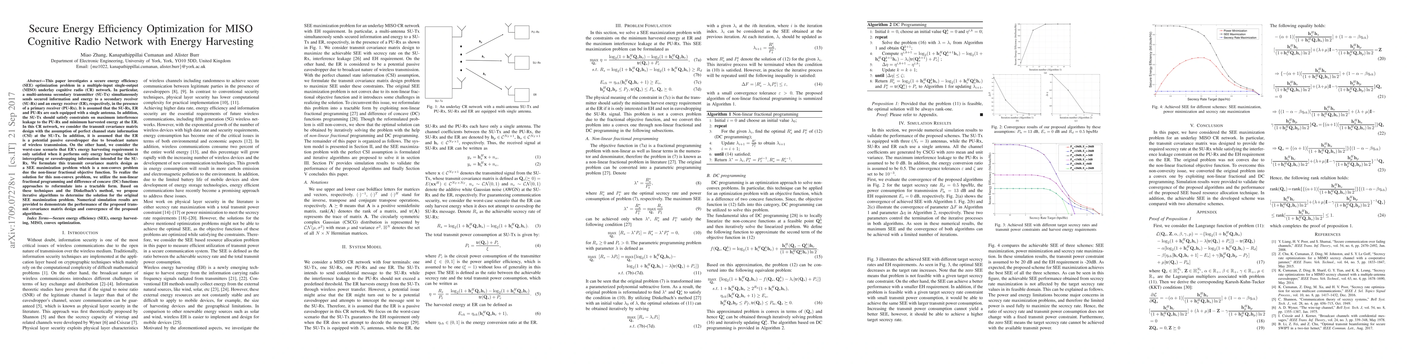 This paper optimizes secure energy efficiency in a MISO cognitive radio network with energy harvesting, addressing interference constraints and potential eavesdropping. It proposes iterative algorithms to solve a non-convex SEE maximization problem using fractional programming and DC functions, validated through numerical simulations.