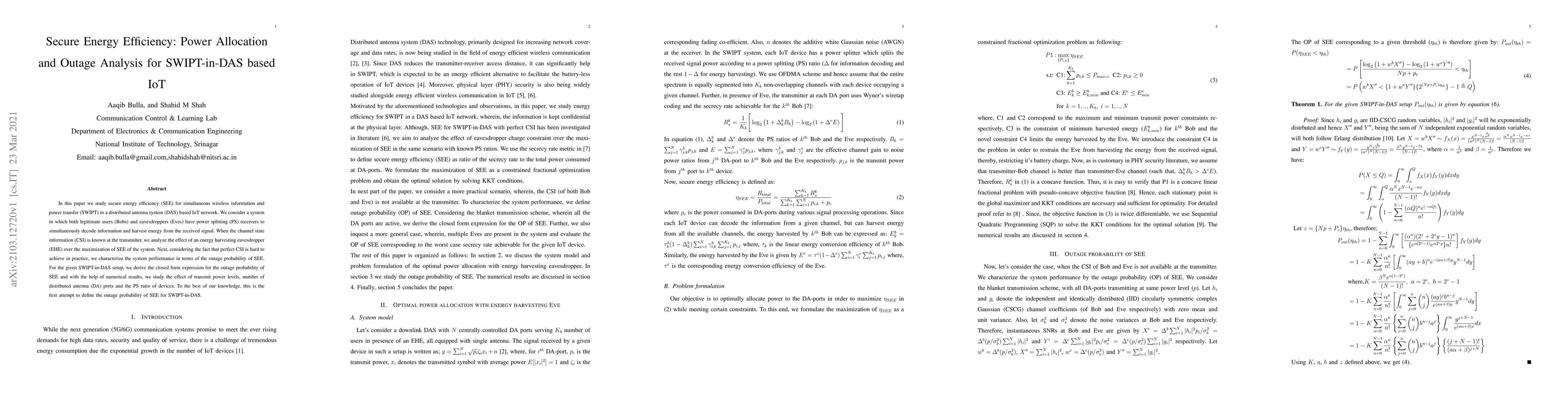 This paper investigates secure energy efficiency in IoT networks using SWIPT within a DAS, analyzing the impact of energy harvesting eavesdroppers on SEE maximization. It derives a closed-form expression for the outage probability of SEE and examines the influence of various parameters through numerical results.