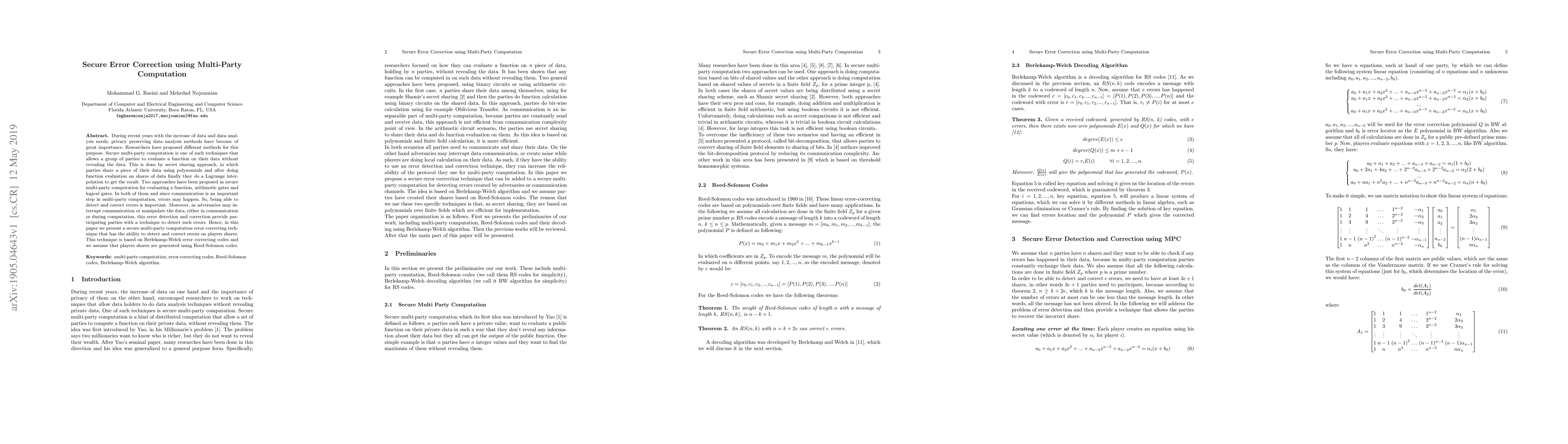 This paper proposes a secure multi-party computation error correction technique using Berlekamp-Welch codes to detect and correct errors in players' shares, assuming these shares are generated via Reed-Solomon codes, thereby enhancing privacy-preserving data analysis.