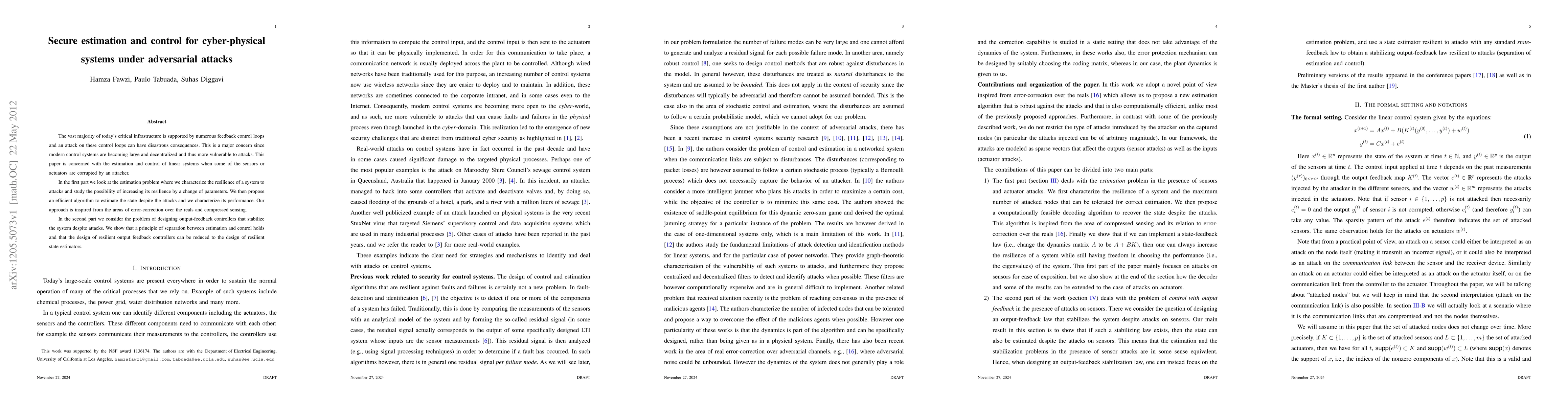 The vast majority of today's critical infrastructure is supported by numerous feedback control loops and an attack on these control loops can have disastrous consequences. This is a major concern since modern control systems are becoming large and decentralized and thus more vulnerable to attacks. This paper is concerned with the estimation and control of linear systems when some of the sensors or actuators are corrupted by an attacker. In the first part we look at the estimation problem where we characterize the resilience of a system to attacks and study the possibility of increasing its resilience by a change of parameters. We then propose an efficient algorithm to estimate the state despite the attacks and we characterize its performance. Our approach is inspired from the areas of error-correction over the reals and compressed sensing. In the second part we consider the problem of designing output-feedback controllers that stabilize the system despite attacks. We show that a principle of separation between estimation and control holds and that the design of resilient output feedback controllers can be reduced to the design of resilient state estimators.