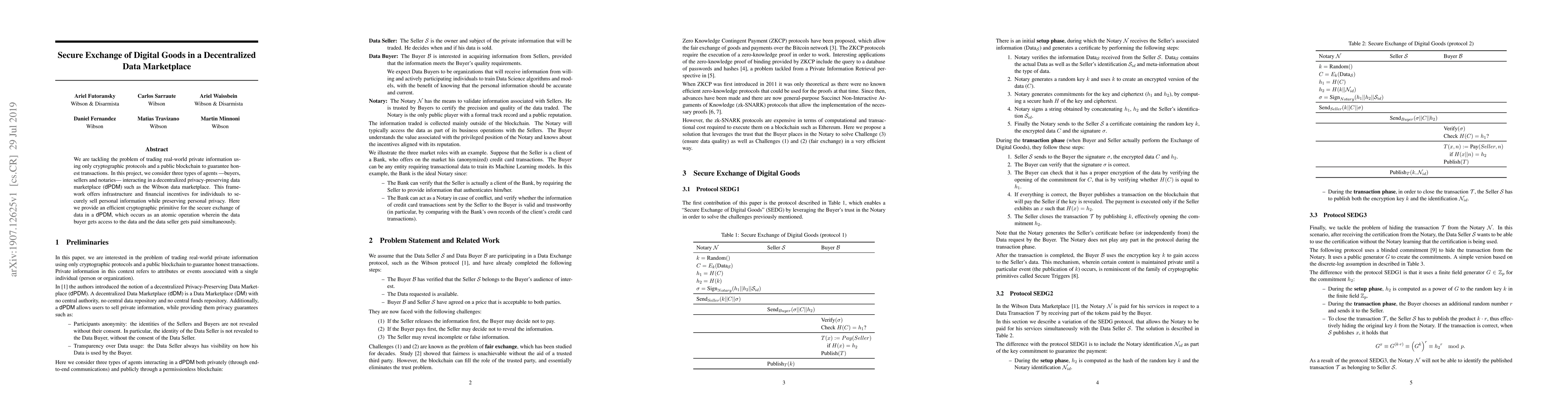 We are tackling the problem of trading real-world private information using only cryptographic protocols and a public blockchain to guarantee honest transactions. In this project, we consider three types of agents --buyers, sellers and notaries-- interacting in a decentralized privacy-preserving data marketplace (dPDM) such as the Wibson data marketplace. This framework offers infrastructure and financial incentives for individuals to securely sell personal information while preserving personal privacy. Here we provide an efficient cryptographic primitive for the secure exchange of data in a dPDM, which occurs as an atomic operation wherein the data buyer gets access to the data and the data seller gets paid simultaneously.