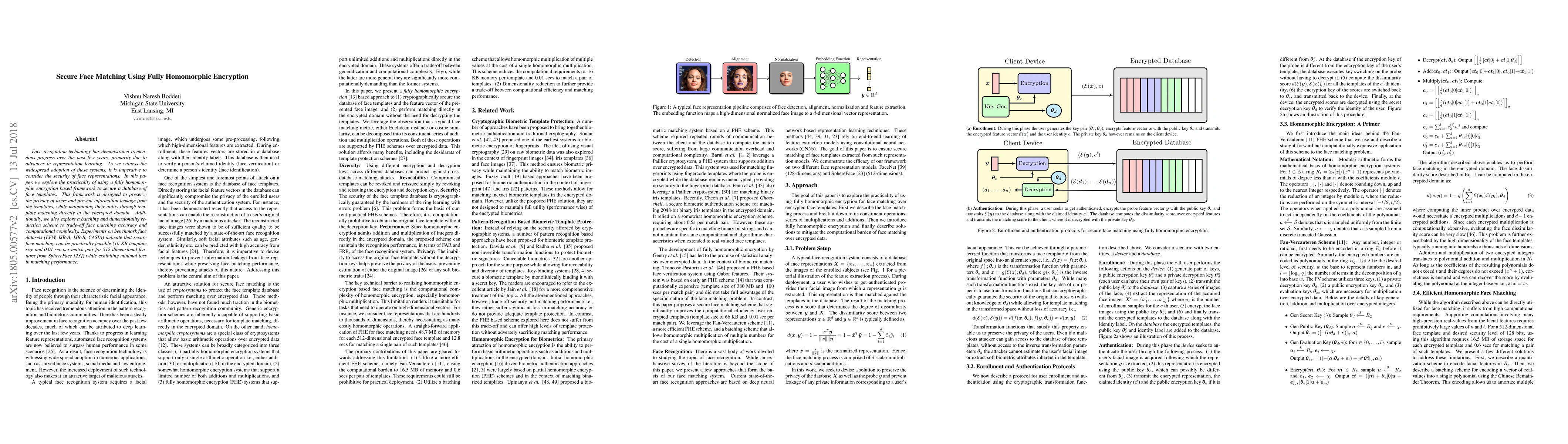 This paper proposes a fully homomorphic encryption framework to secure face recognition systems, ensuring user privacy and minimal information leakage. Experiments show that secure face matching is feasible with acceptable accuracy and computational efficiency, using benchmark datasets.