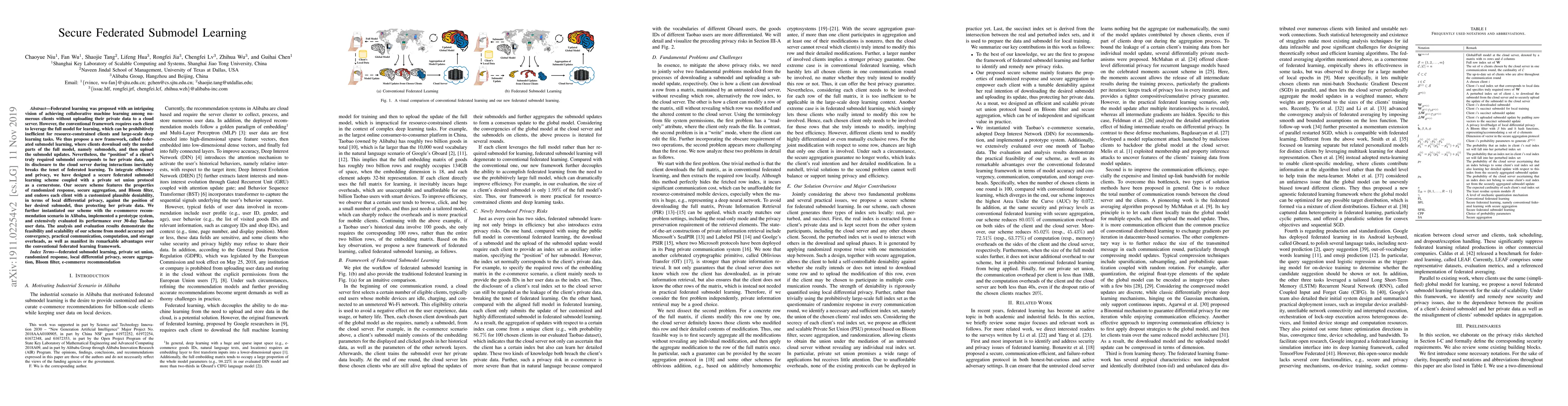 This paper proposes a secure federated submodel learning framework to enhance the efficiency and privacy of federated learning. It introduces a method where clients only download and update necessary submodels, addressing the inefficiency of full model usage. The scheme incorporates privacy-preserving techniques like randomized response, secure aggregation, and Bloom filters to protect clients' private data, demonstrating its effectiveness through an e-commerce recommendation scenario and extensive performance evaluation.