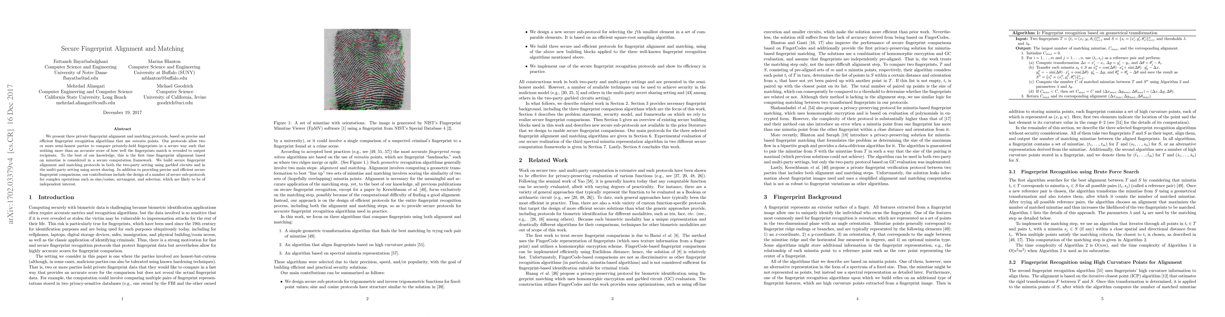 This paper introduces secure protocols for fingerprint alignment and matching based on minutiae points, allowing multiple parties to compare fingerprints privately without revealing any additional information. The protocols utilize garbled circuits and secret sharing for secure computation in two-party and multi-party settings, respectively.