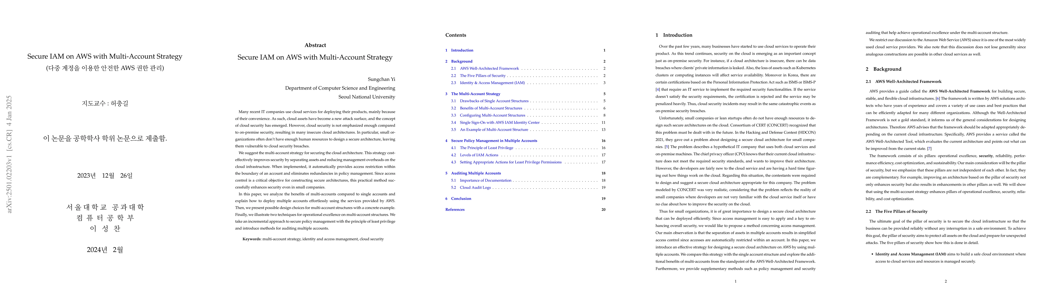 This paper proposes a multi-account strategy to enhance security in AWS cloud architectures, especially for small organizations. It compares the benefits of multi-account setups over single accounts, detailing deployment and design choices, and introduces methods for secure policy management and auditing across accounts.