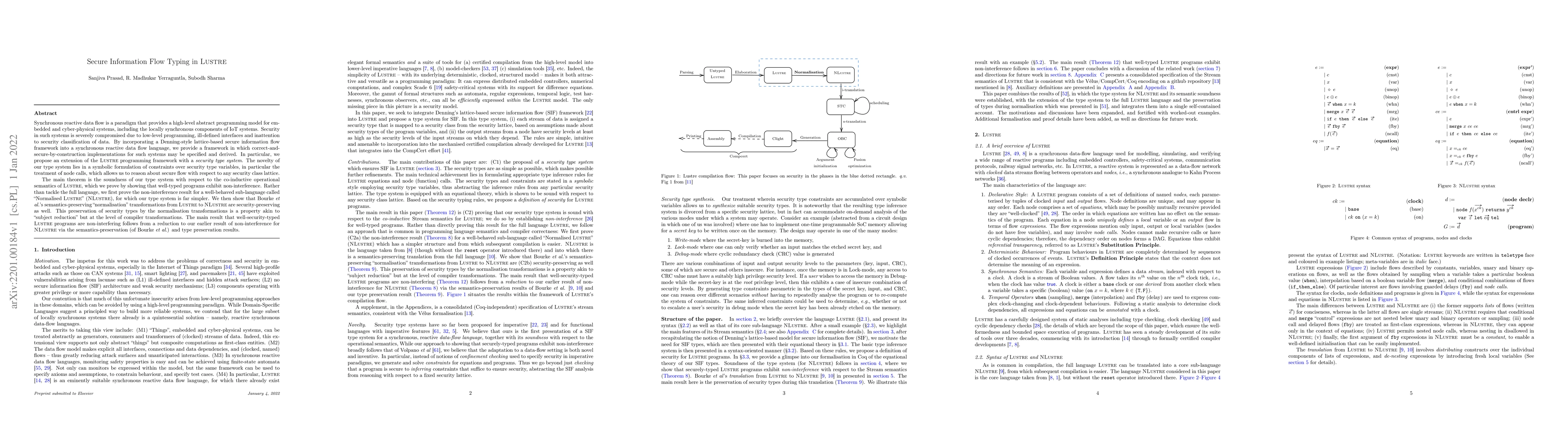 This paper proposes a secure information flow typing system for the LUSTRE programming language, enhancing its security by incorporating a Denning-style lattice-based framework. The authors extend LUSTRE with a security type system that ensures non-interference, proving its soundness through a sub-language called Normalised Lustre (NLustre) before extending the results to the full LUSTRE language.