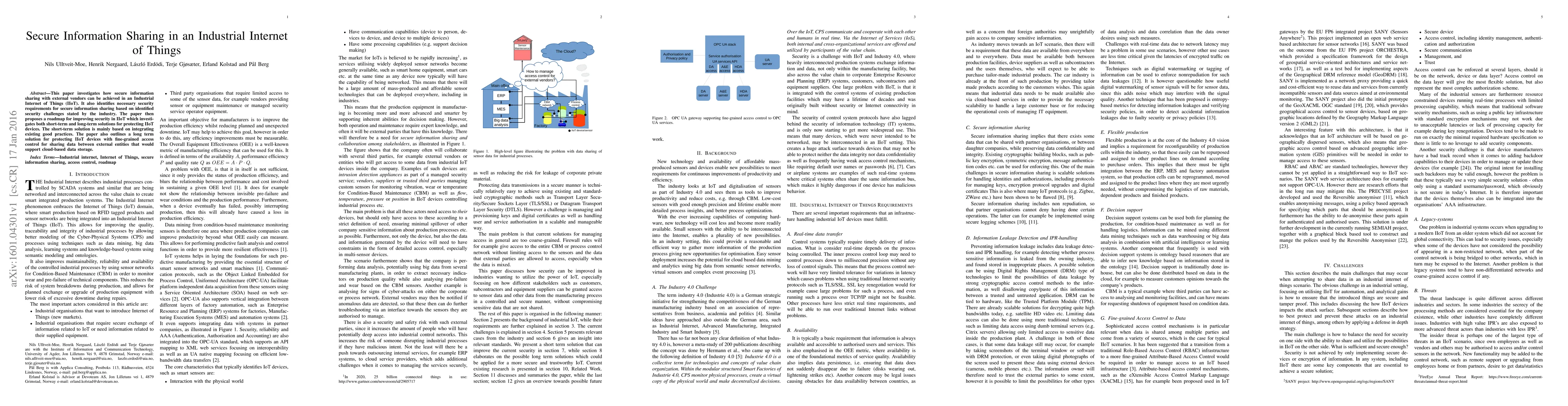 This paper investigates how secure information sharing with external vendors can be achieved in an Industrial Internet of Things (IIoT). It also identifies necessary security requirements for secure information sharing based on identified security challenges stated by the industry. The paper then proposes a roadmap for improving security in IIoT which investigates both short-term and long-term solutions for protecting IIoT devices. The short-term solution is mainly based on integrating existing good practices. The paper also outlines a long term solution for protecting IIoT devices with fine-grained access control for sharing data between external entities that would support cloud-based data storage.