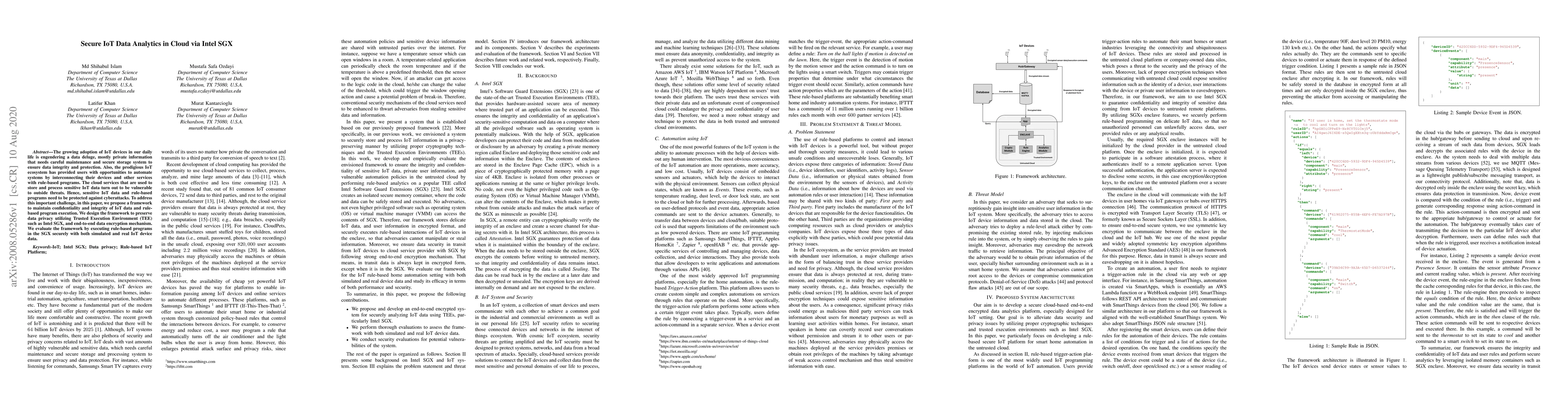 This paper proposes a framework to secure IoT data analytics in the cloud using Intel SGX to protect data integrity and confidentiality. The framework employs Trusted Execution Environments and end-to-end encryption to safeguard sensitive IoT data and rule-based programs from cyberattacks.