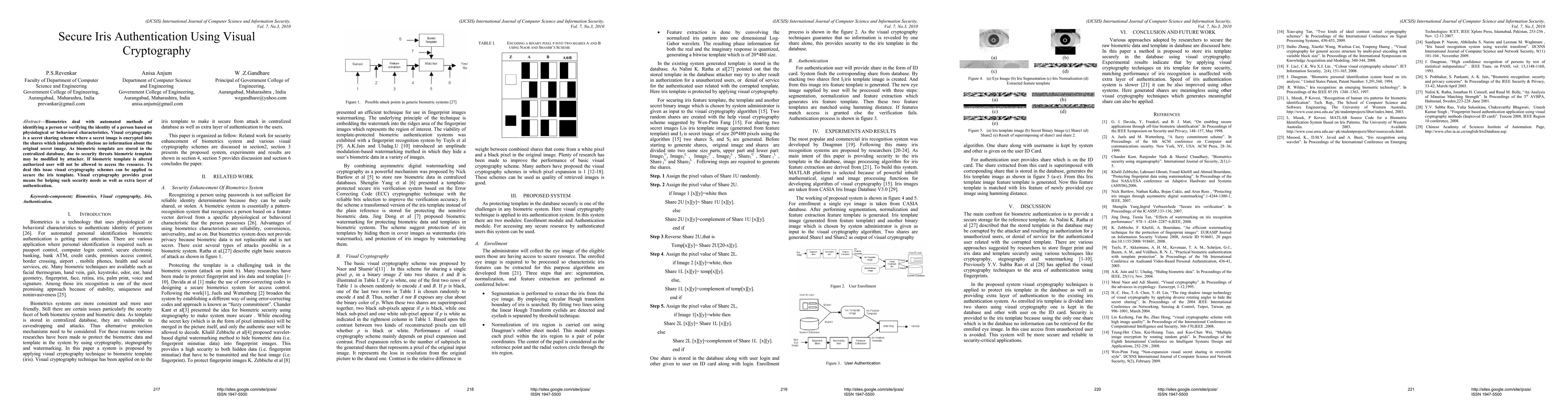 This paper proposes a secure iris authentication method using visual cryptography to protect biometric templates stored in centralized databases from unauthorized modification. Visual cryptography ensures that each share of the encrypted iris template reveals no information alone, adding an extra layer of security and authentication.