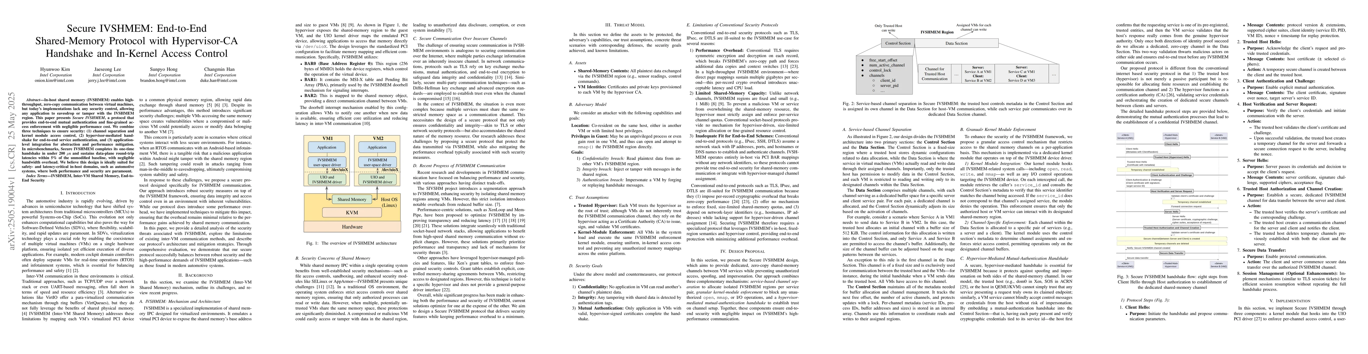 This work combines multiple security techniques to provide end-to-end security for IVSHMEM with minimal performance degradation, making it suitable for safety-critical applications.