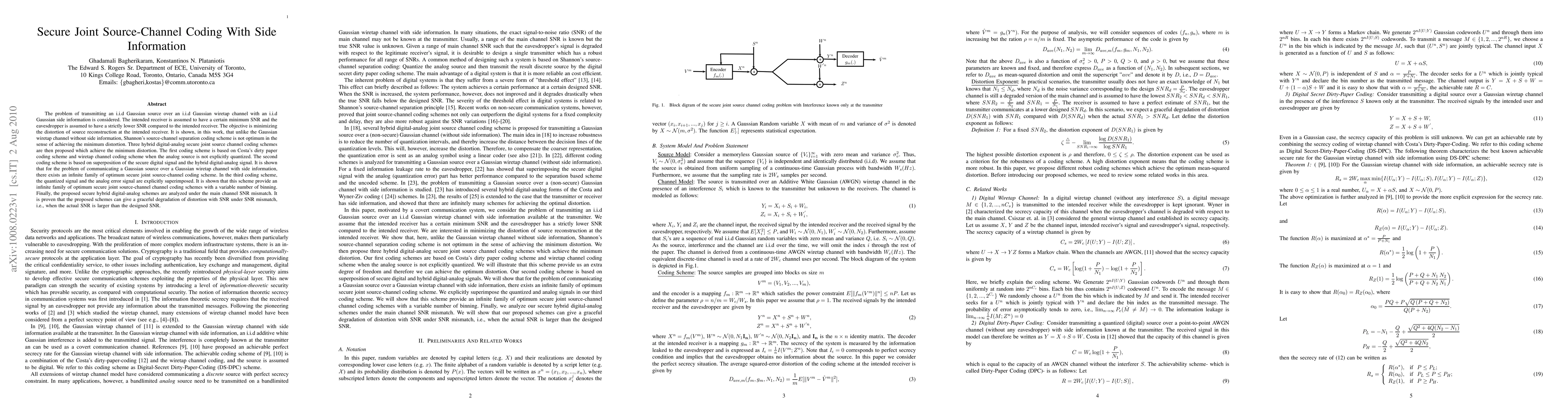 The paper analyzes secure joint source-channel coding for transmitting an i.i.d Gaussian source over an i.i.d Gaussian wiretap channel with side information, proposing three hybrid digital-analog schemes to minimize distortion at the intended receiver.
