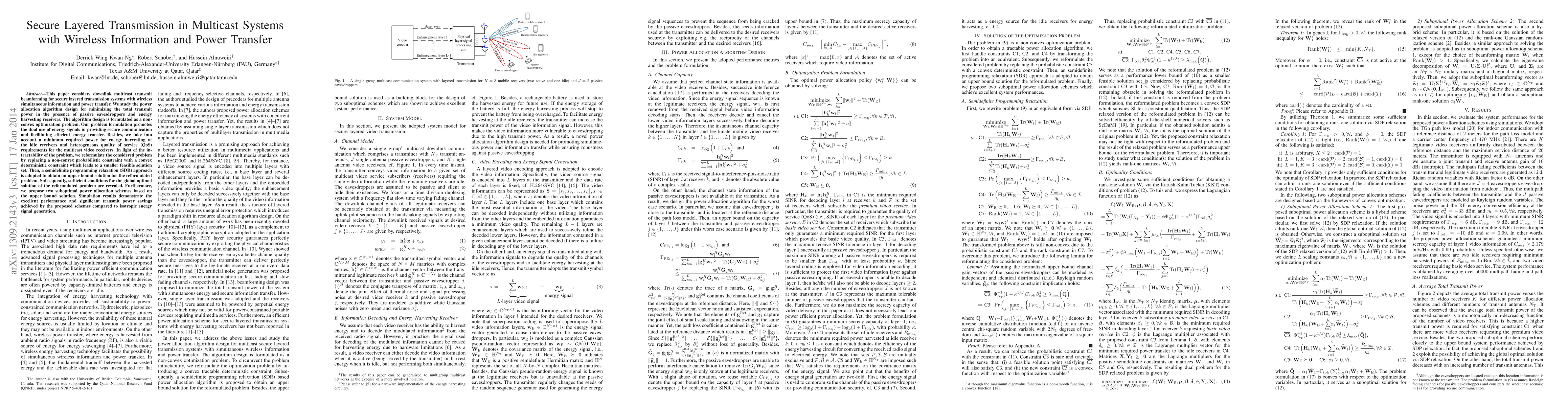 This paper proposes a secure layered transmission method for multicast systems that simultaneously transfers information and power wirelessly, focusing on minimizing transmit power while considering passive eavesdroppers and energy harvesting receivers. The study reformulates the non-convex optimization problem into a convex one using semidefinite programming, and presents two suboptimal power allocation schemes that achieve significant power savings.