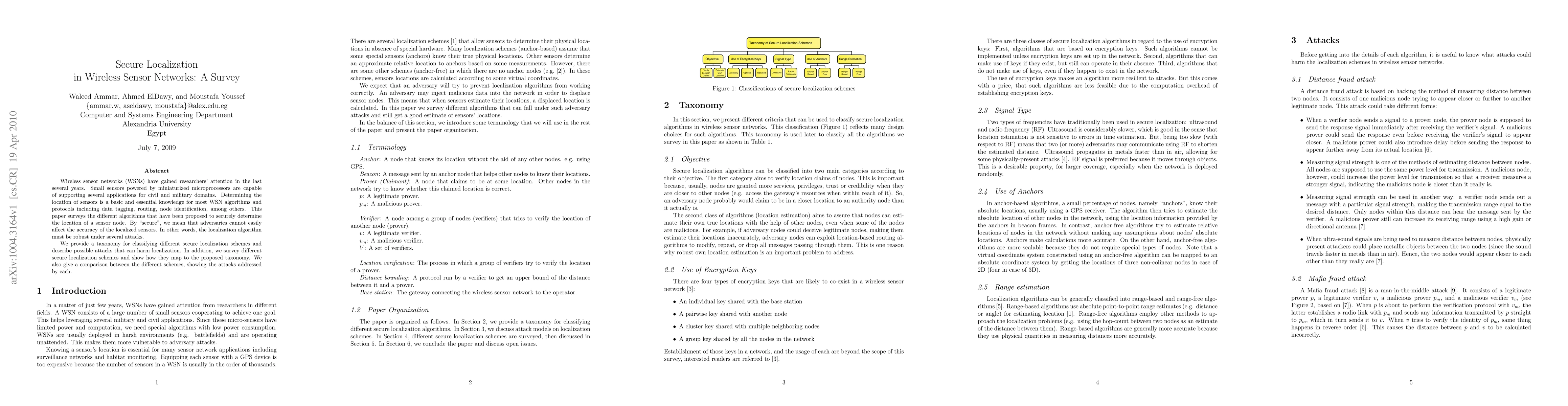 This paper surveys secure localization algorithms for wireless sensor networks (WSNs), focusing on methods that ensure location accuracy despite potential adversarial attacks. The paper categorizes these schemes, discusses various attack vectors, and provides a comparative analysis of the robustness of different localization strategies.