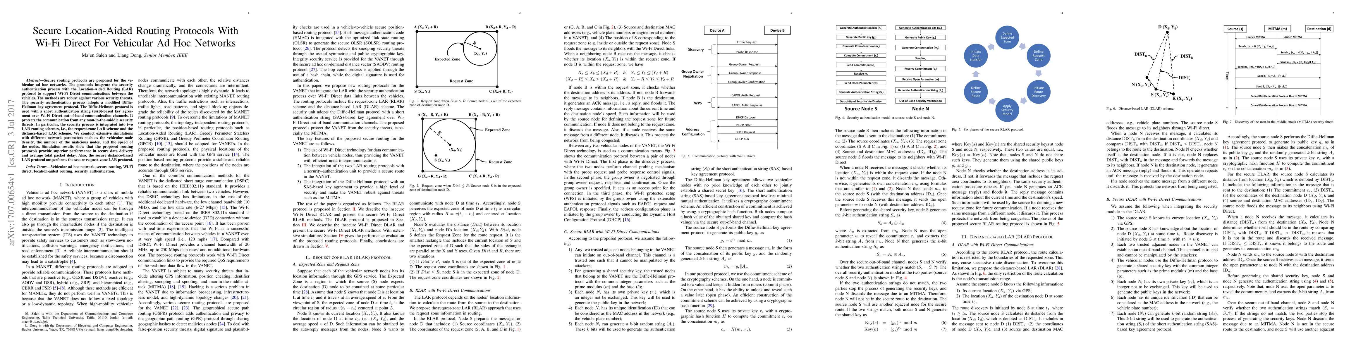This paper proposes secure routing protocols for vehicular ad hoc networks that integrate security authentication with Location-Aided Routing (LAR) to support Wi-Fi Direct communications. The protocols utilize a modified Diffie-Hellman key agreement with a short authentication string to protect against man-in-the-middle attacks, demonstrating superior performance in secure data delivery and lower packet delay in simulations.