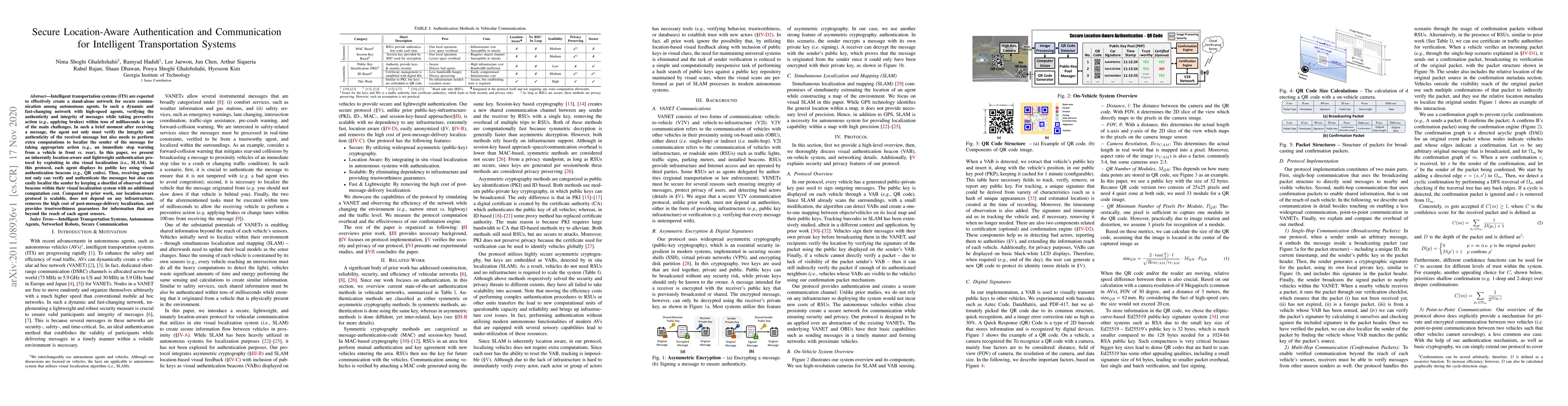 This paper presents a location-aware authentication protocol for intelligent transportation systems that uses visual localization to verify authenticity and localize senders without additional computation cost or infrastructure reliance.
