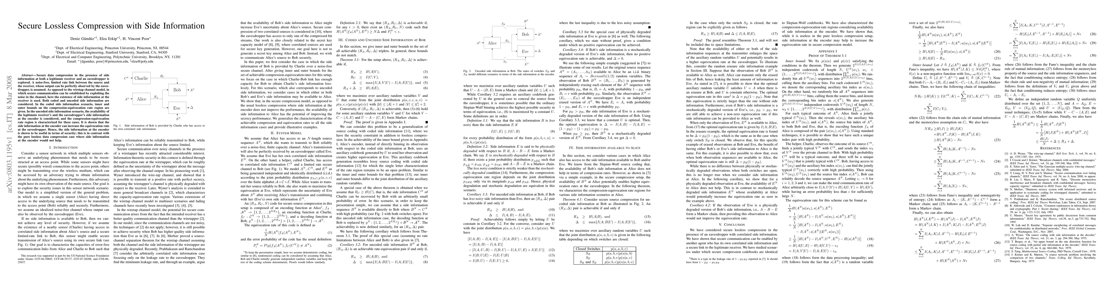 This paper investigates secure lossless compression with side information, demonstrating how side information at both legitimate and eavesdropper receivers can enhance security. It characterizes the compression-equivocation rate region under both coded and uncoded side information scenarios, showing that side information at the encoder can increase the eavesdropper's equivocation rate, thus improving security.