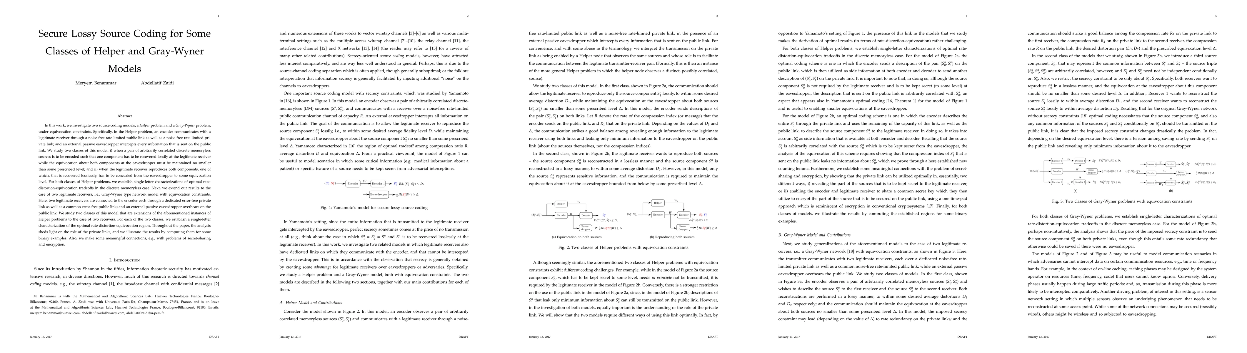 In this work, we investigate two source coding models, a \emph{Helper} problem and a \emph{Gray-Wyner} problem, under equivocation constraints. Specifically, in the Helper problem, an encoder communicates with a legitimate receiver through noise-free rate-limited public and private links; and an external passive eavesdropper intercepts every information that is sent on the public link. We study two classes of this model: i) when a pair of arbitrarily correlated discrete memoryless sources is to be encoded such that one component has to be recovered lossily at the legitimate receiver while the equivocation about both components at the eavesdropper must be maintained no smaller than some prescribed level; and ii) when the legitimate receiver reproduces both components, one of which, that is recovered losslessly, has to be concealed from the eavesdropper to some equivocation level. For both classes problems, we establish single-letter characterizations of optimal rate-distortion-equivocation tradeoffs in the discrete memoryless case. Next, we extend our results to the case of two legitimate receivers, i.e., Gray-Wyner network with equivocation constraints. Here, two legitimate receivers are connected to the encoder each through a dedicated error-free private link as well as a common error-free public link; and an external passive eavesdropper overhears on the public link. We study two classes of this model that are extensions of the aforementioned instances of Helper problems to the case of two receivers. For each of the two classes, we establish a single-letter characterization of the optimal rate-distortion-equivocation region. Throughout the paper, the analysis sheds light on the role of the private links, and we illustrate the results by computing them for some binary examples. Also, we make some meaningful connections, e.g., with problems of secret-sharing and encryption.