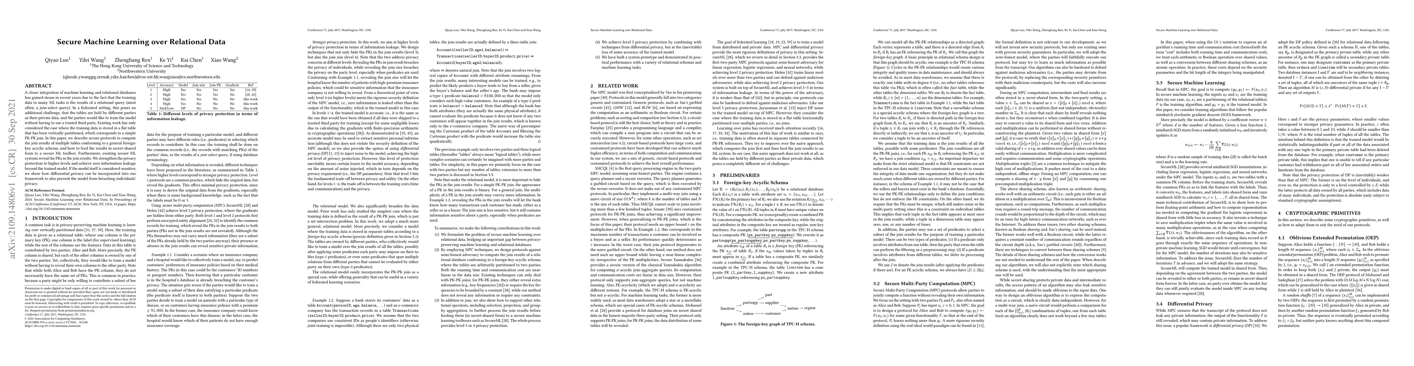 This paper proposes secure protocols for federated machine learning over relational data, enabling multiple parties to train models without revealing their private data. It enhances privacy protection to prevent information leakage beyond the trained model and integrates differential privacy to safeguard the model itself.