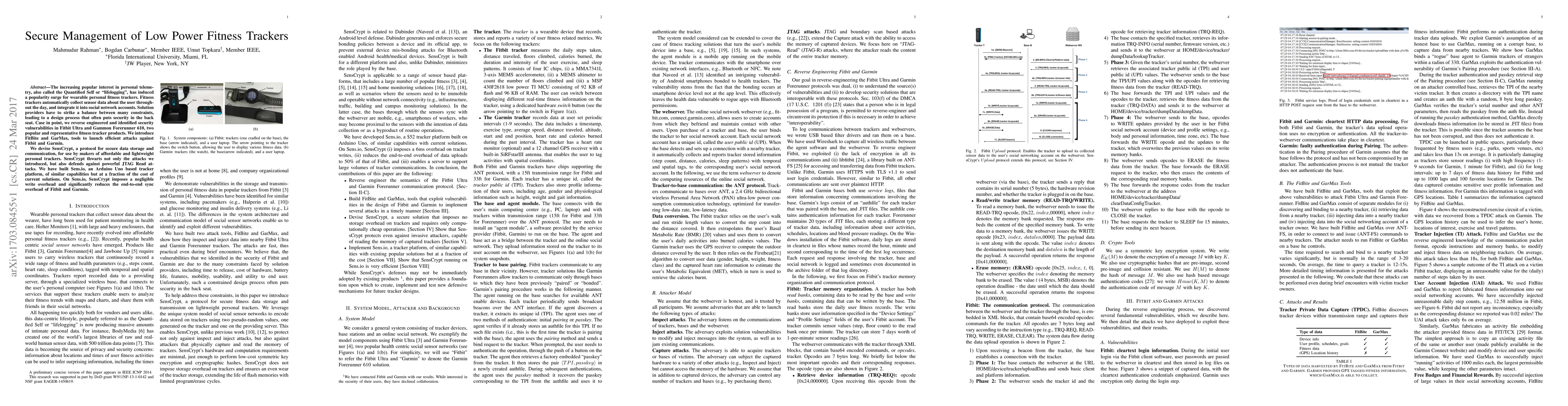 This paper identifies security vulnerabilities in popular fitness trackers like Fitbit Ultra and Garmin Forerunner 610, and introduces SensCrypt, a secure protocol for data storage and communication. SensCrypt is implemented on Sens.io, a low-cost tracker platform, which demonstrates negligible write overhead and reduced sync time compared to existing solutions.