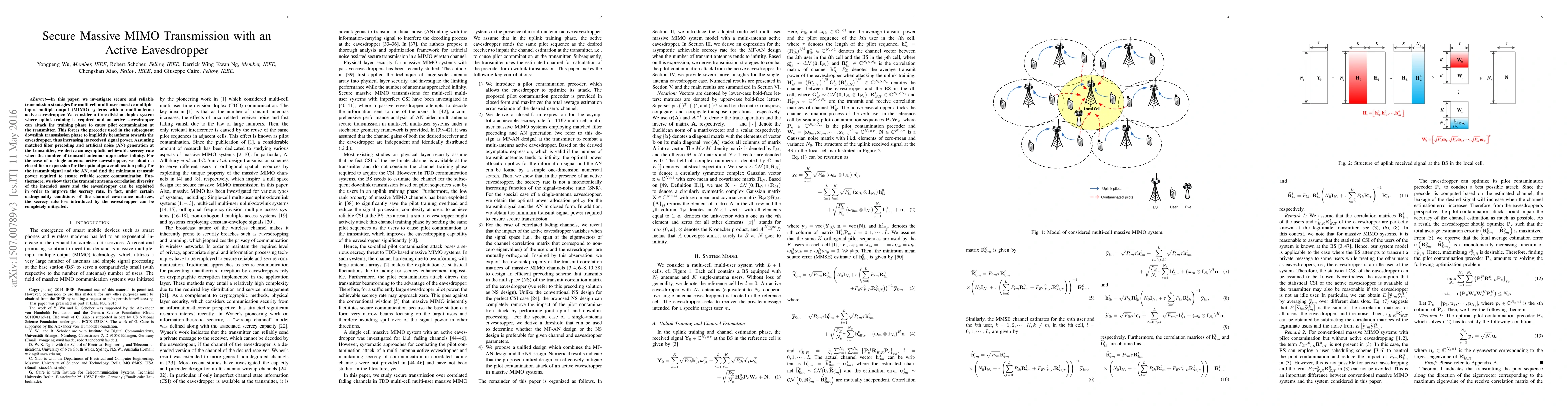 This paper explores secure transmission strategies for multi-cell massive MIMO systems with an active eavesdropper, focusing on pilot contamination during uplink training. It derives an asymptotic achievable secrecy rate and optimal power allocation for secure communication, demonstrating that antenna correlation diversity can mitigate secrecy rate loss under orthogonal channel conditions.